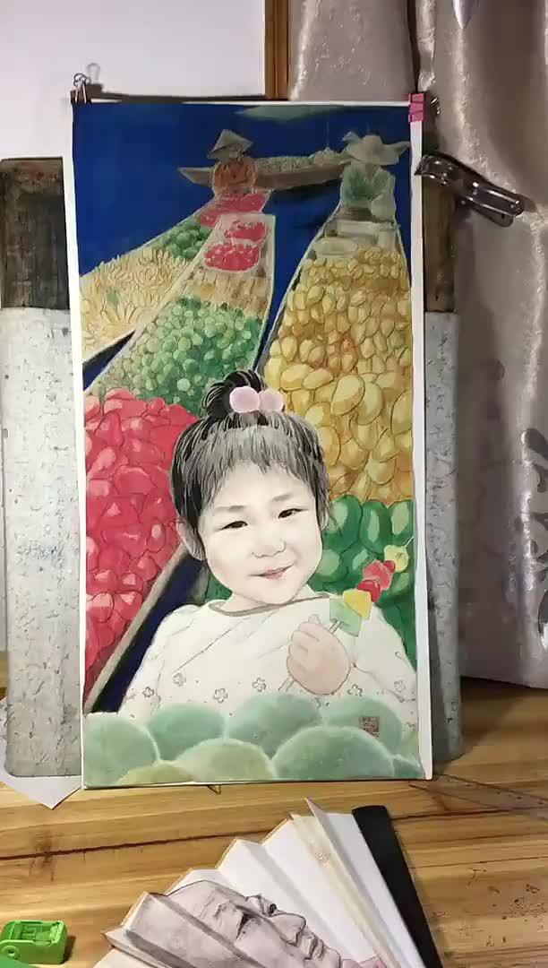 小馨正在吃冰淇淋,我收到的三张照片都在吃冰淇淋,其中两张逆光好画一些,但这张正面迎光的表情最开心。根据经验正面光、单眼皮宝宝以国画表现较难,不过难不倒我,画废两张,第三张成稿,非常漂亮。