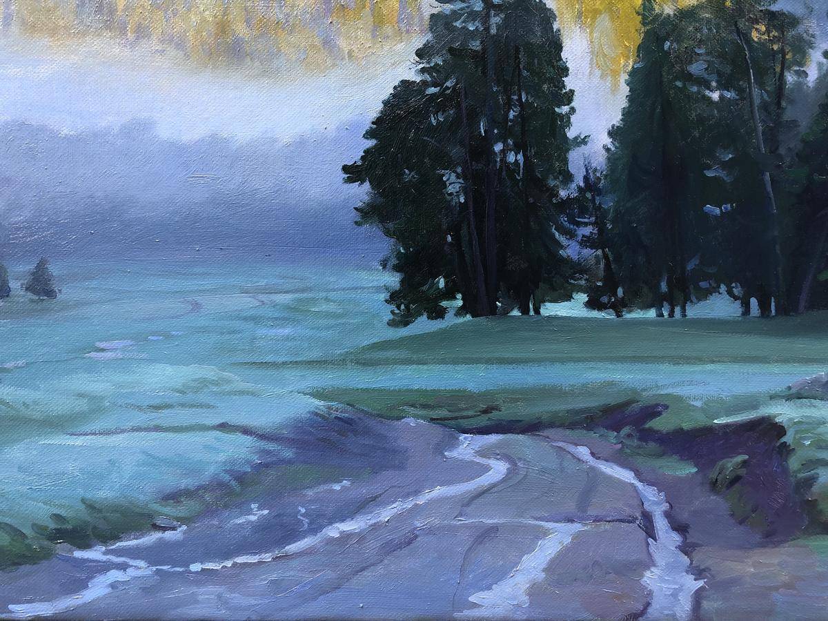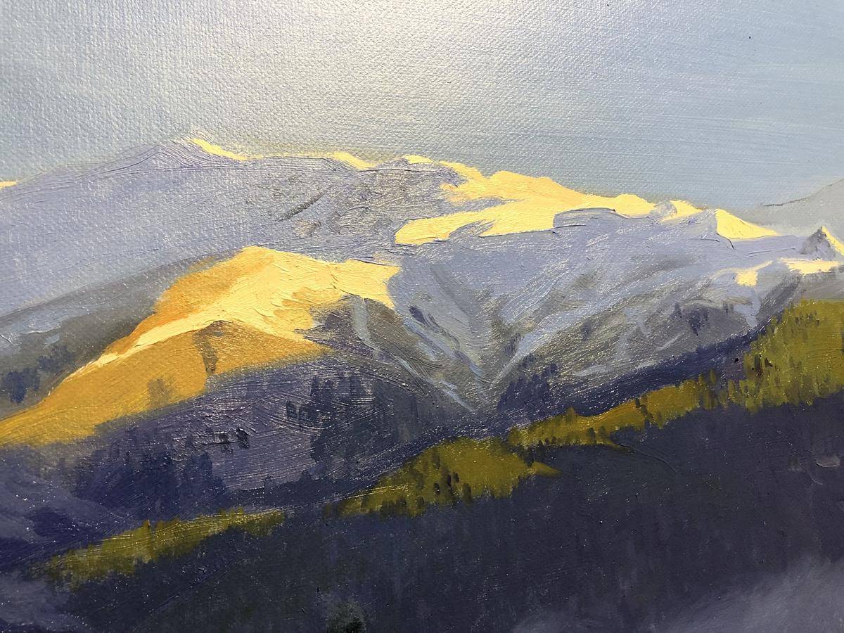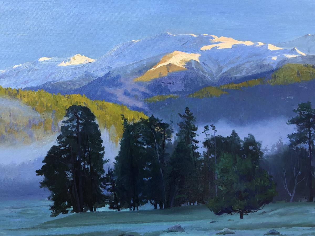 高加索是俄罗斯著名自然景观,作品取材于自然而不完全照搬,大胆使用蓝色,在蓝色调中寻找微妙的色彩变化,草地主观处理成浅宝石绿和淡紫色,是画面中大面积蓝色更加稳定,(作品主图是在户外自然光下拍摄的,图片最后一幅是在室内暖光灯下拍出的画面效果)