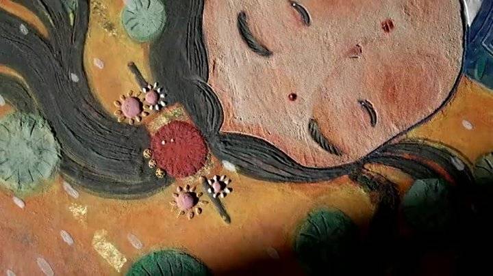 此作品用天然矿物质颜料绘制,金箔点缀,矿石颗粒十分有质感,阳光下闪闪发光。