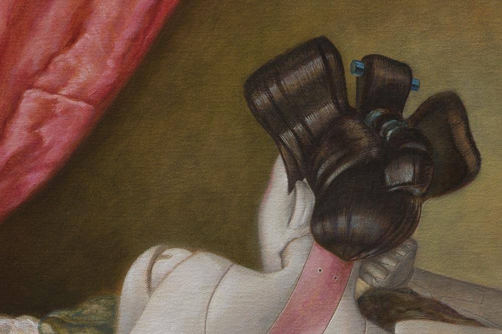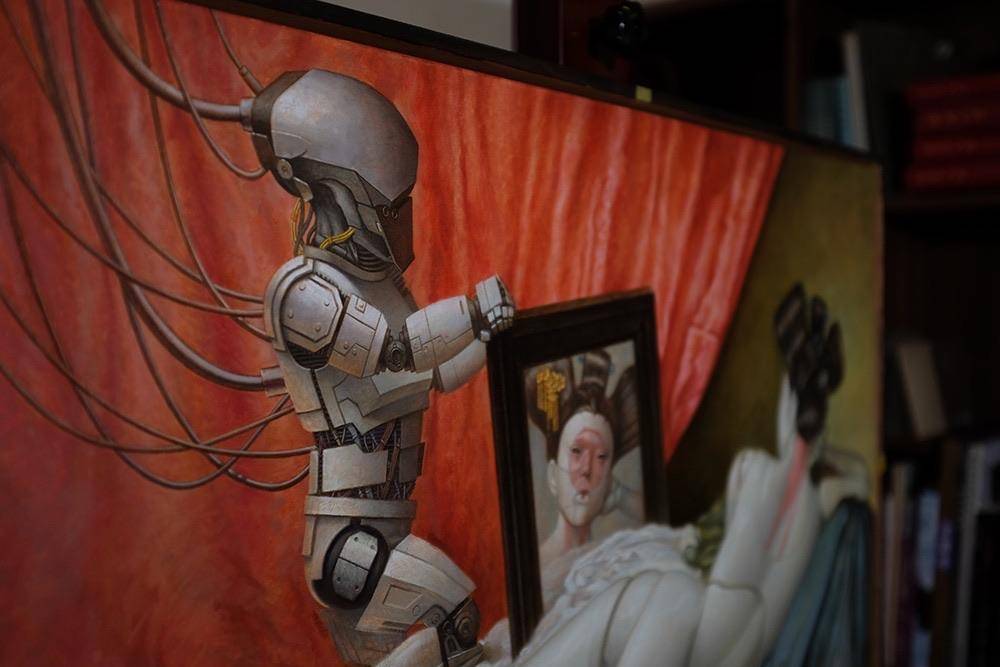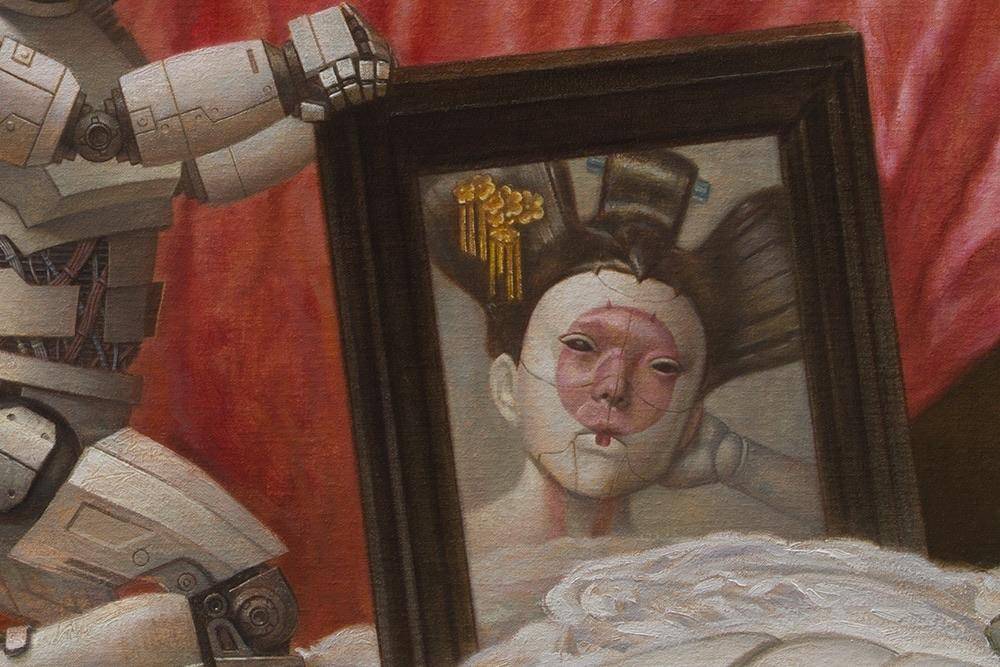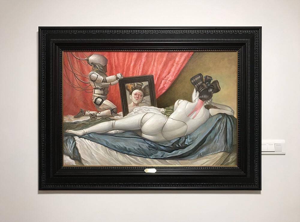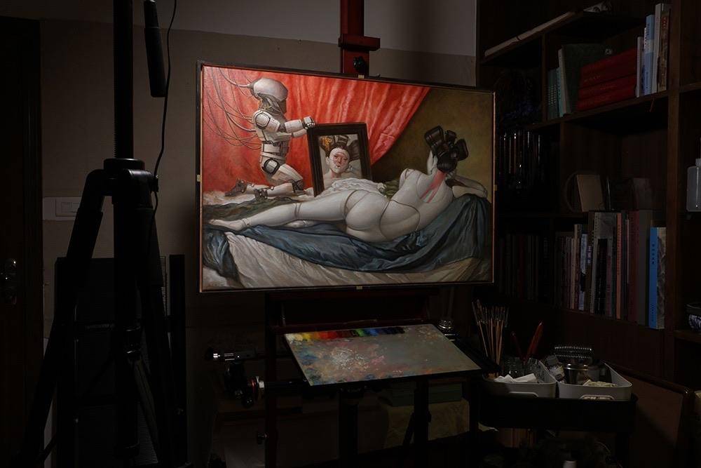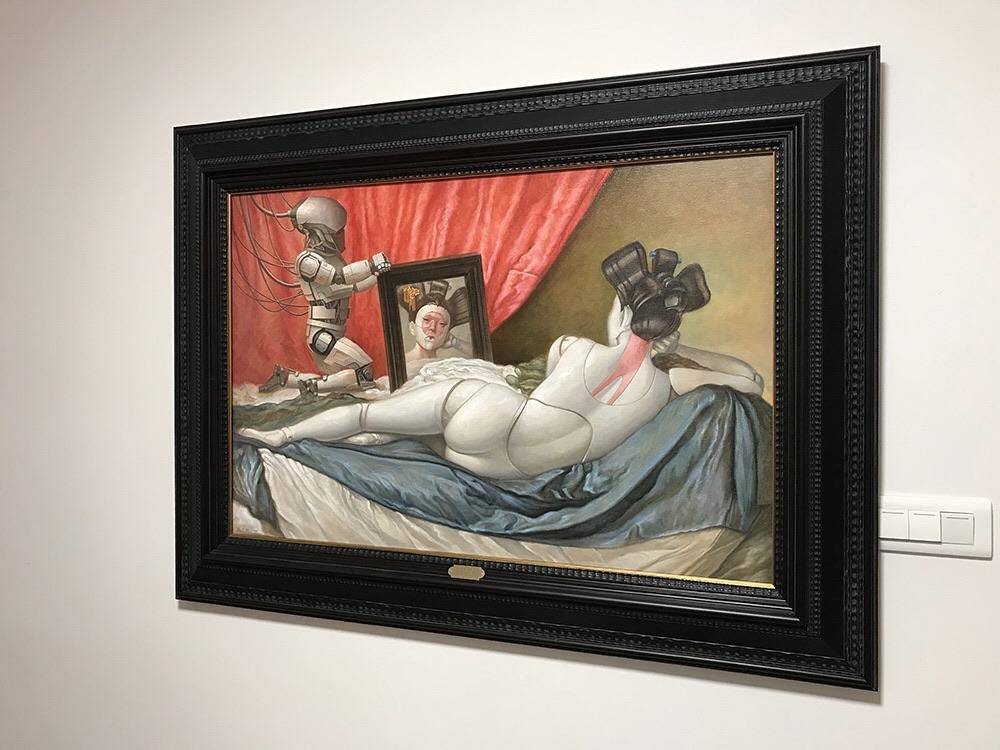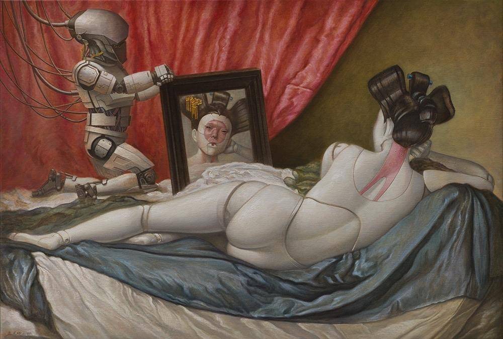 概括讲,《镜前的艺妓》挪用了委拉斯凯兹的《镜前的维纳斯》,并在此画面基础上融入了赛博朋克元素,例如以《攻壳机动队》影片中艺妓机器人等为原型的概念设定……