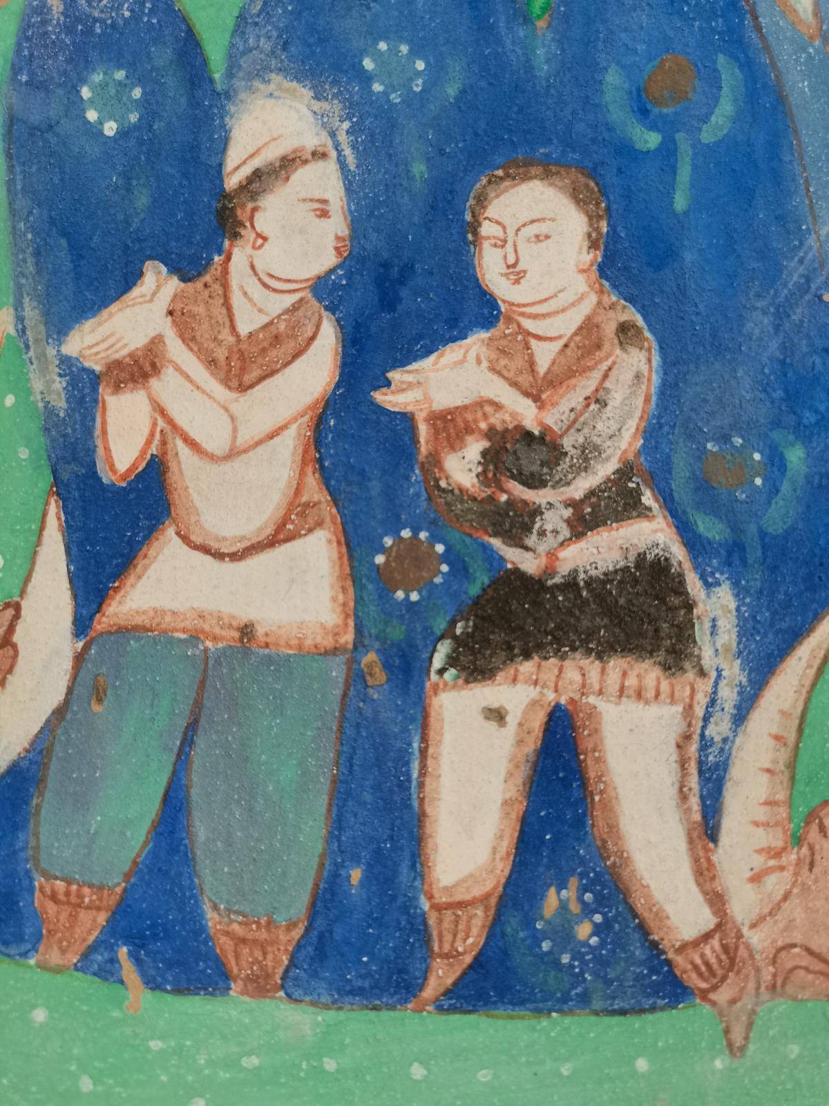 岩彩画基底制作以木板、亚麻布、皮胶、克孜尔土等材料。画面采用天然矿物质颜料绘制完成。图片是专业影棚拍摄和自然光下的不同效果,矿物颗粒在不同光线下的反射效果也不同,所以色彩会有丰富多彩的变化。绘制过程采用打磨、雕刻、罩染、水洗等技法来呈现壁画上千年的岁月痕迹,所以画面上的划痕、龟裂、脱落等效果均是正常现象不属于损坏,画找有缘人购买需周知。(实木外框手工上色,关于作品题目的本生故事可百度)视频可以看出闪闪发光的矿物色颗粒