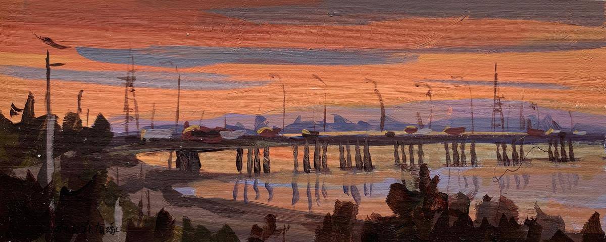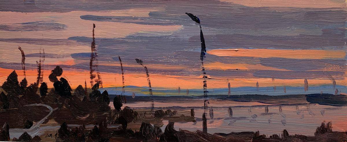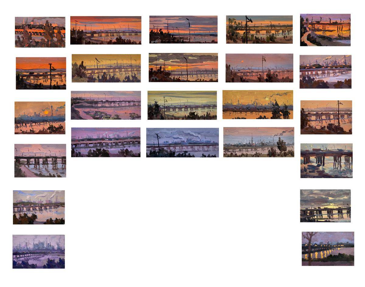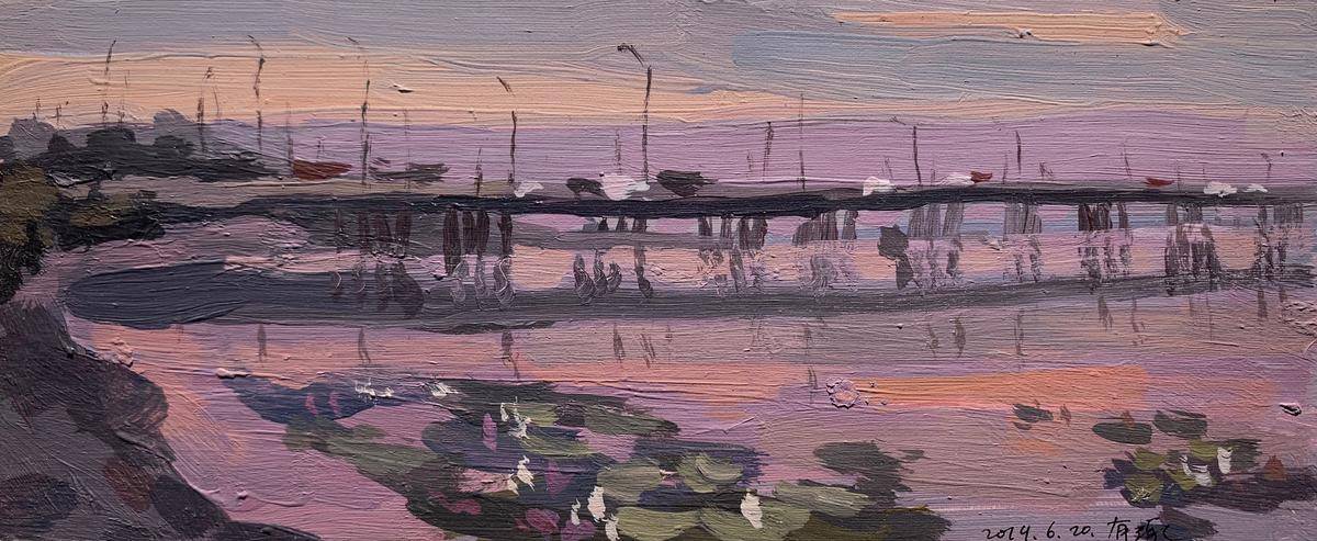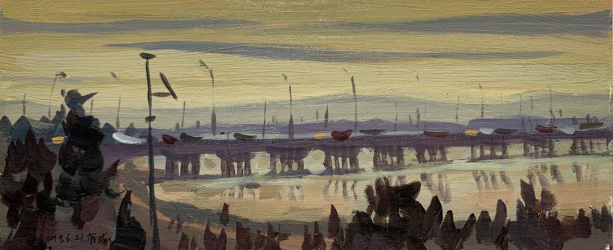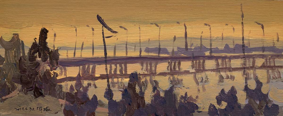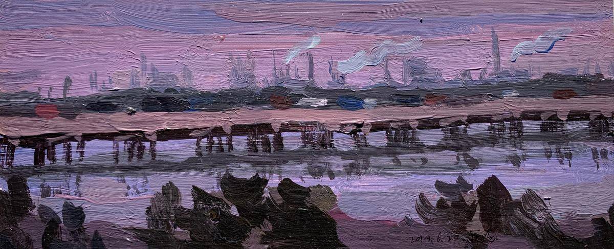 东黑河大桥,是从我家去学校的必经之路,也是出城的必经之路,每天早晨出来写生也要路过这里……也常常在这里写生,记录了这座桥的各个角落。其中这一个角度整理出了36张不同色调的小画。选了12张10✖️16cm和12张10✖️24cm的小画组合装表参加展览……很幸运,2020年荣获内蒙古草原油画院第四届写生展学术奖。