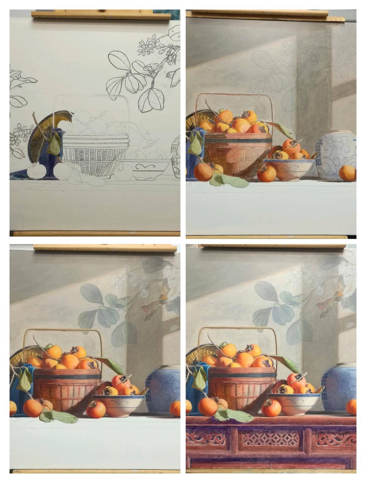 - 写实技法:运用高超的写实技巧,对物体的质感(如柿子的橙红光泽、竹篮的编织纹理、瓷器的釉面反光、木材的古朴肌理)进行了精细刻画,光影的处理尤其出色——阳光的斜射形成明暗对比,让画面富有立体感与空间感。