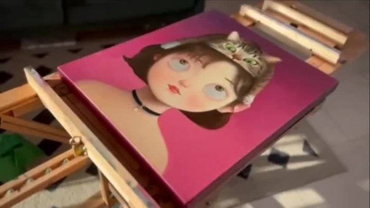 画面里女孩的眼睛向上看头顶的猫咪,和“焦点”里女孩眼睛集中看向鼻尖的蜜蜂是同一个意思:她们在关注某样东西的同时,无意间赋予了自己第二种“表情”,焦点的表情是“斗眼”,而这幅对视的表情是“白眼”。