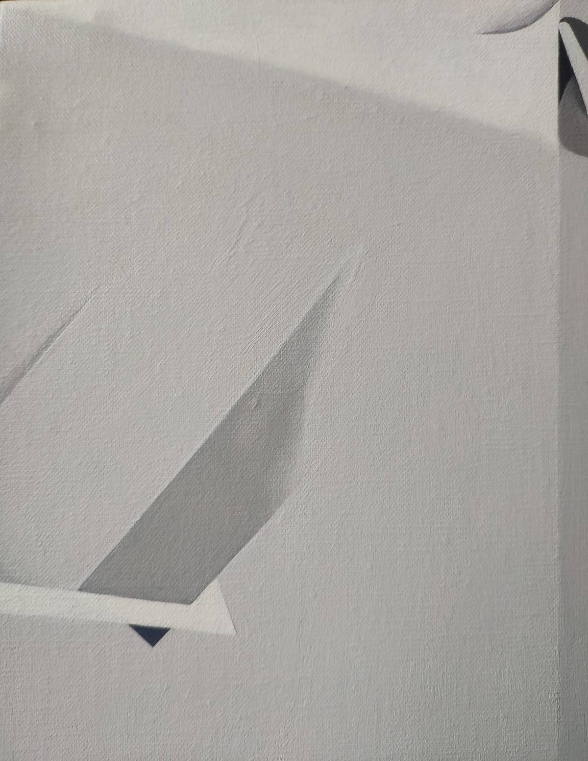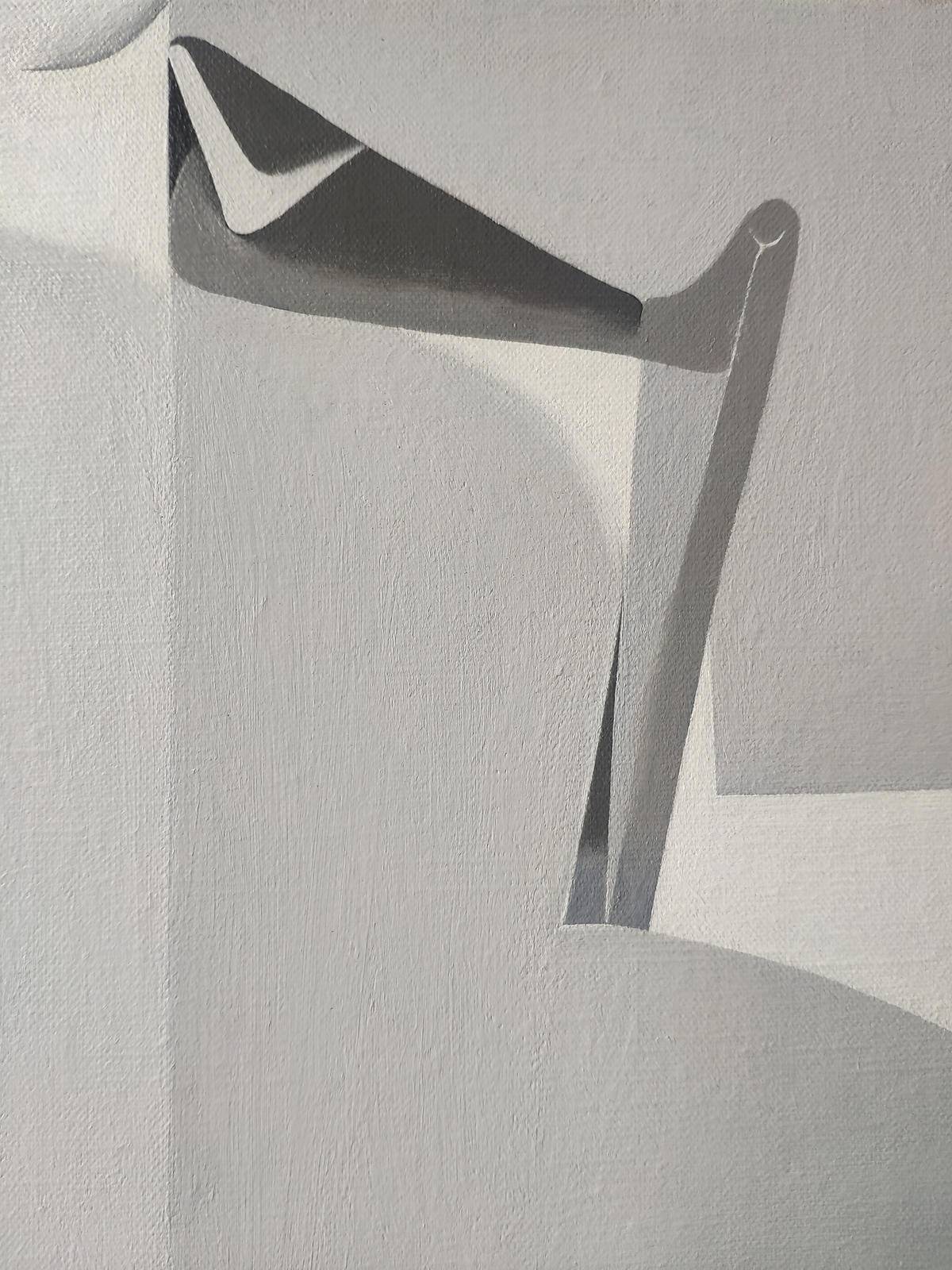 这批作品运用了黑白灰调,当没有了丰富的其他色彩,画面的空间转换关系就显现出来了,一根线尖锐地把画面分割开来,两个陌路相逢的人开始在相邻的舞台表演,他们有时候互相介入对方的领地,有时候并不介入,彬彬有礼,或近或远,大多时候双方的关系是失衡的,因为碰到两个相同的人并用相同的方式互动是很小的几率。我喜欢在画面里铺开时间线,色调的变化、线的节奏的急促和缓慢以及形状的变化都暗合了时间。