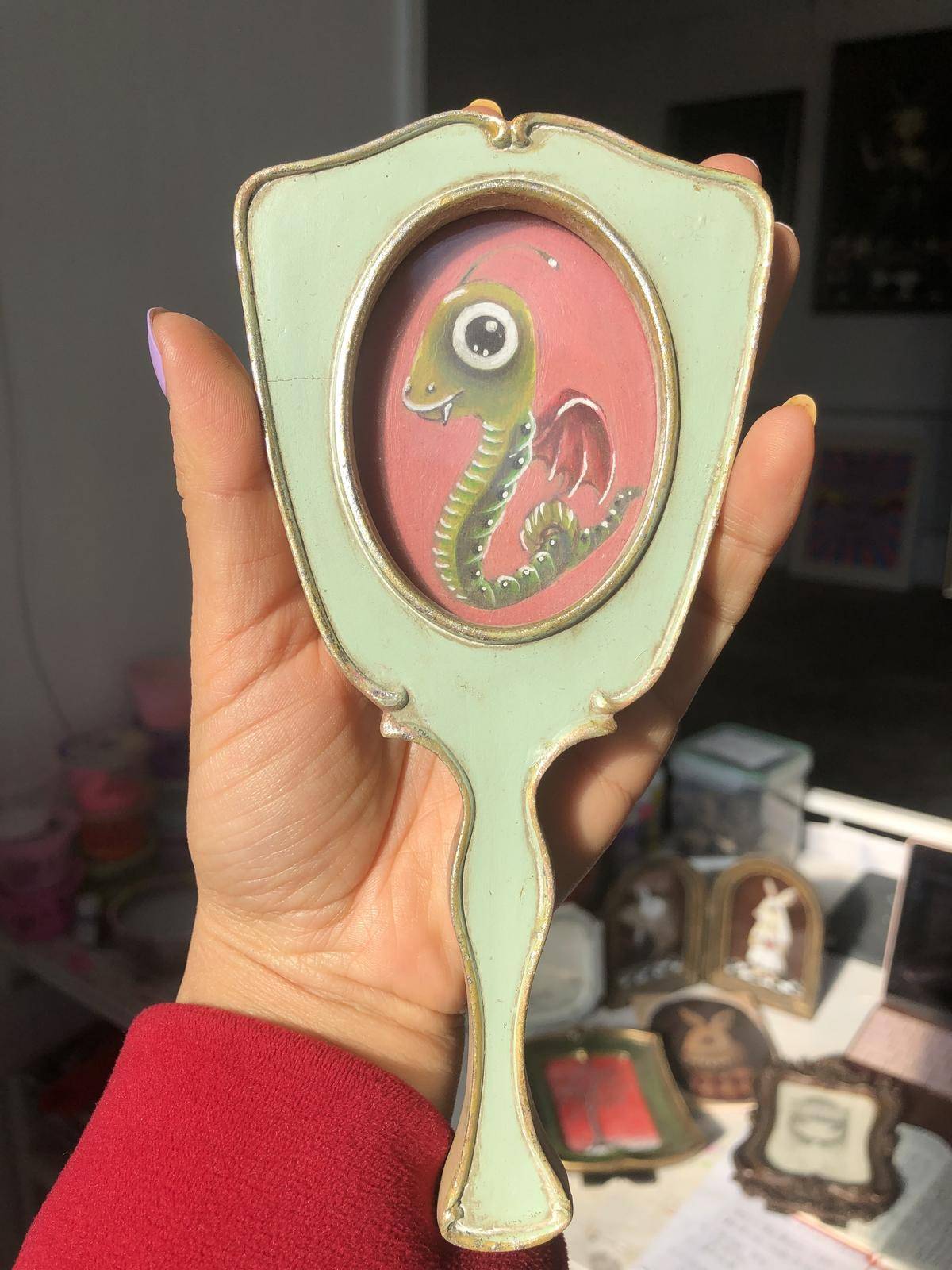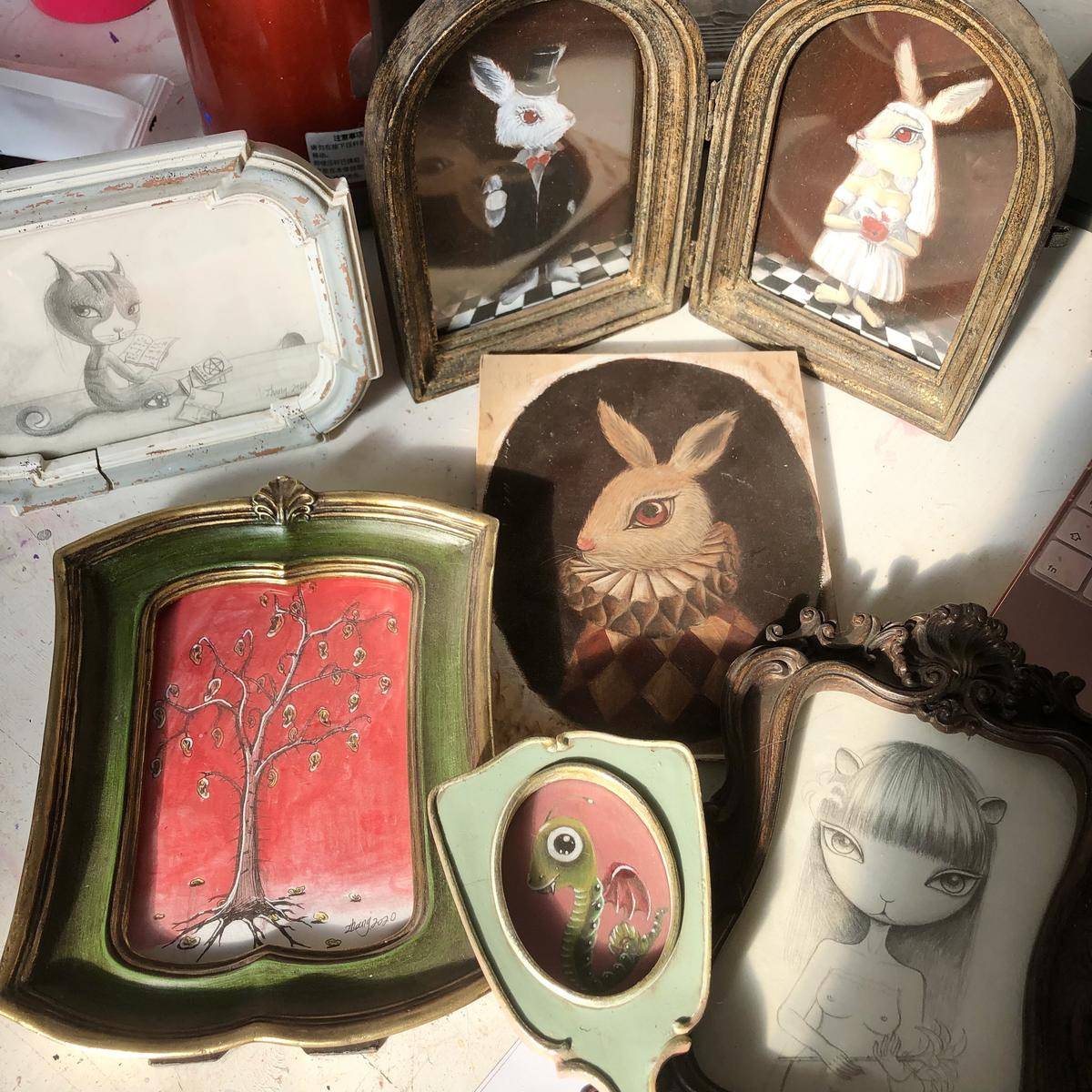 夏天总会在自己的山楂树上发现绿色小毛毛虫🐛,细细的观察也很可爱,灵感就这样诞生啦,画下了我幻想世界里的小飞虫,头上还有发光的触角,沉浸在想象的世界里,就会觉得很美好,这件作品是我创作至今为止最小最Q的一件,独一无二哈哈
