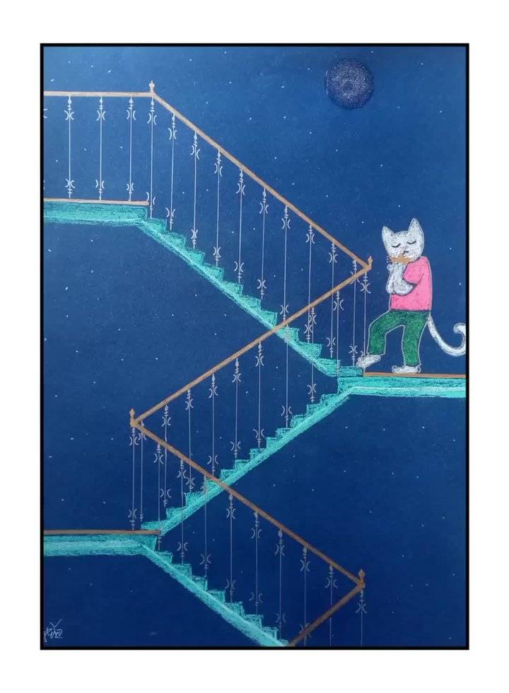 抛去原有的颜色理论知识,继续利用国画笔墨的概念,提升颜色和笔触的音乐性。所以《蓝调猫》并不止画面中的表面意义,更多的是我在用颜色与笔触探索音乐性,希望这一点有赏心者能看出来,那我会很开心,因为在这方面我花了很多力气。