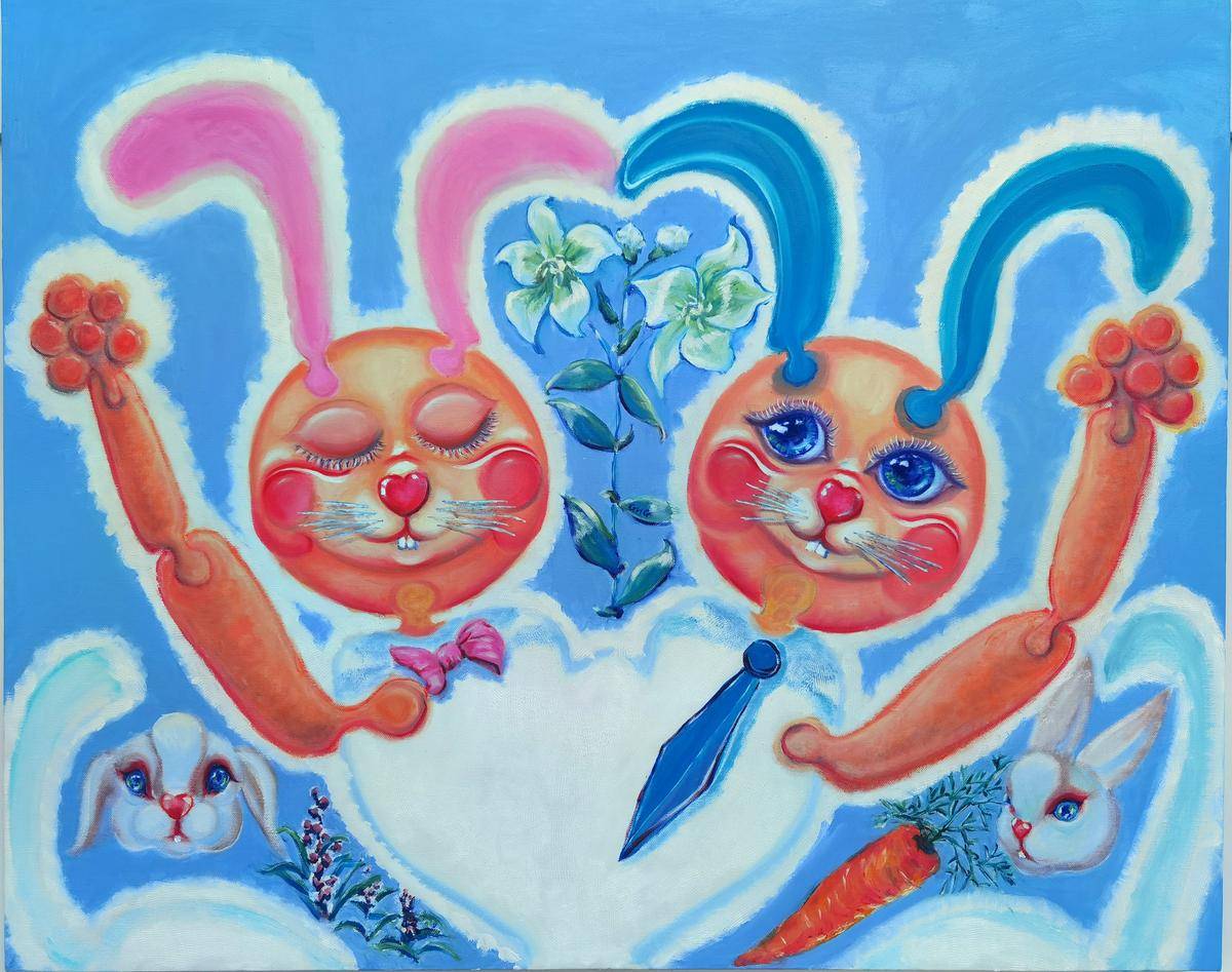 双头兔系列是双头人系列的姊妹篇, 描述人在环境影响下形成的多种性格和由此引发的内心冲突。双头兔一:与真实自我做对的永远都是我们头脑里的分裂与纠结。
