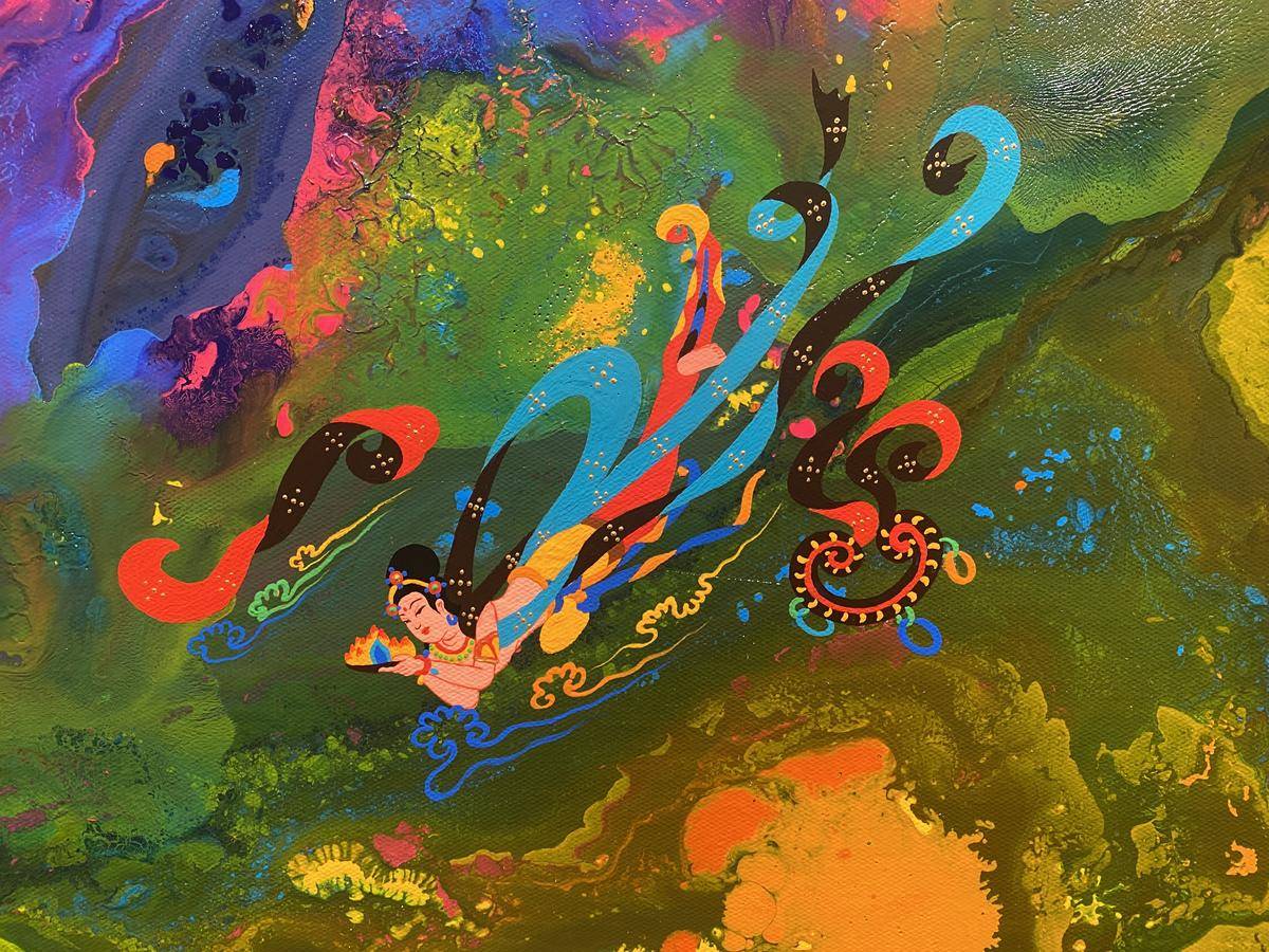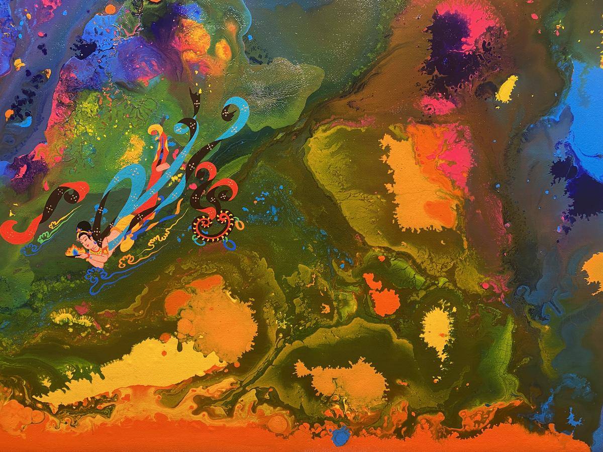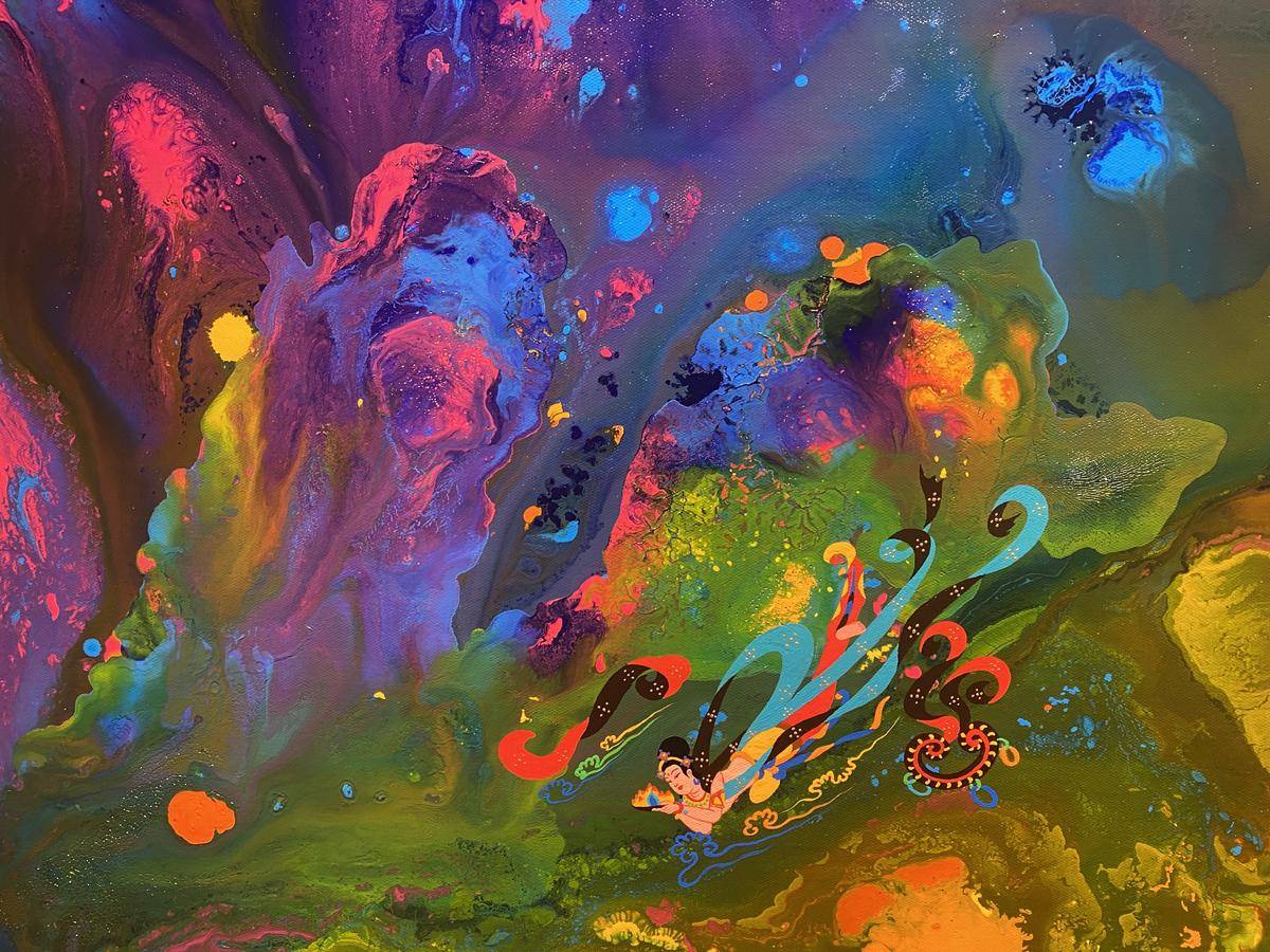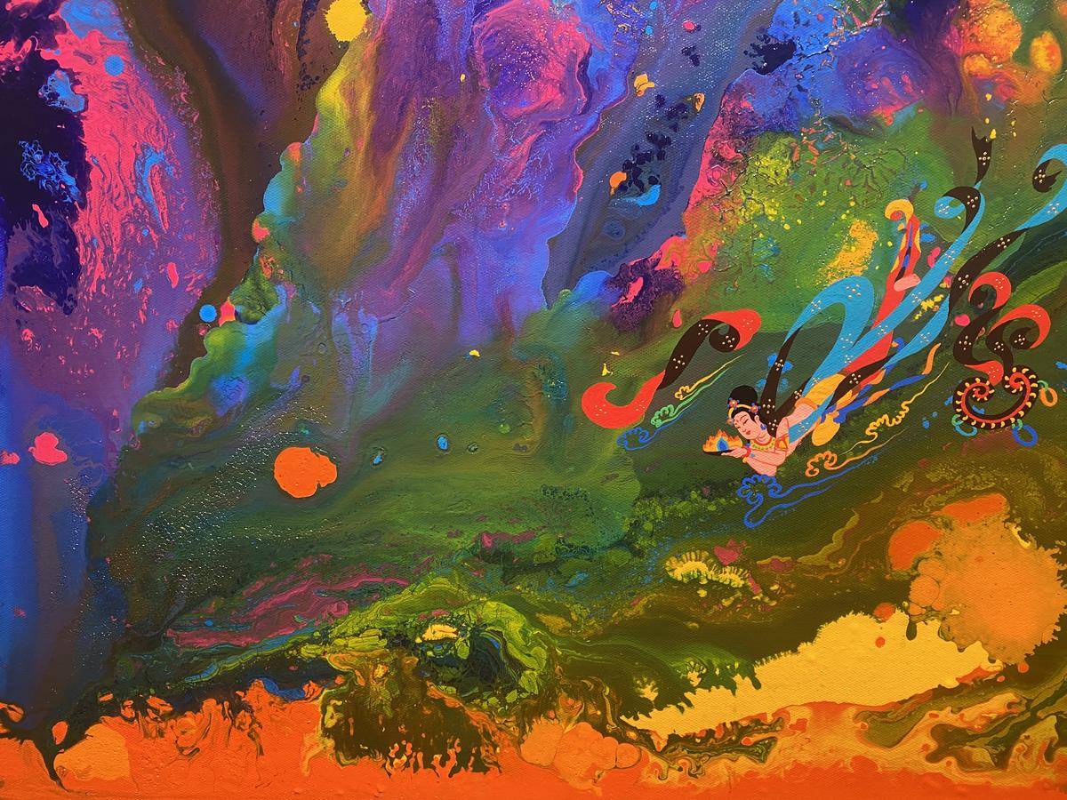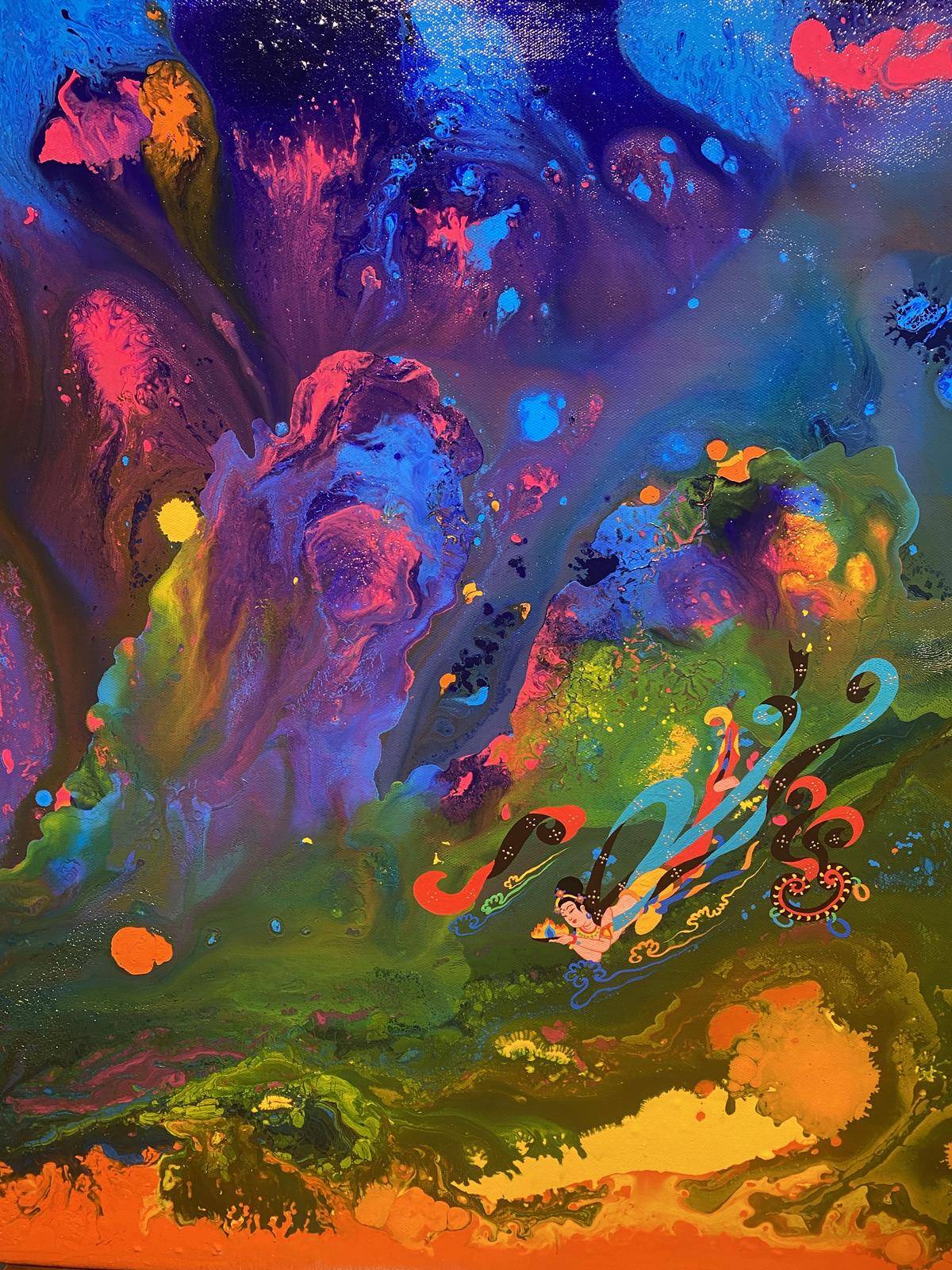 从绘画的意识层面来讲,飞天形象在画面中预示内心世界的自由,犹如颜料随意泼洒所形成的宇宙般浩瀚的梦幻世界,如梦境一般通向内心的精神深处,触碰灵魂。内心世界的自由建立在一个人内心的满足感,希望通过这种浩瀚、梦幻的强烈色彩画面,让人进入超现实、梦境、童真…