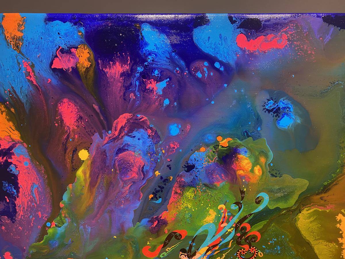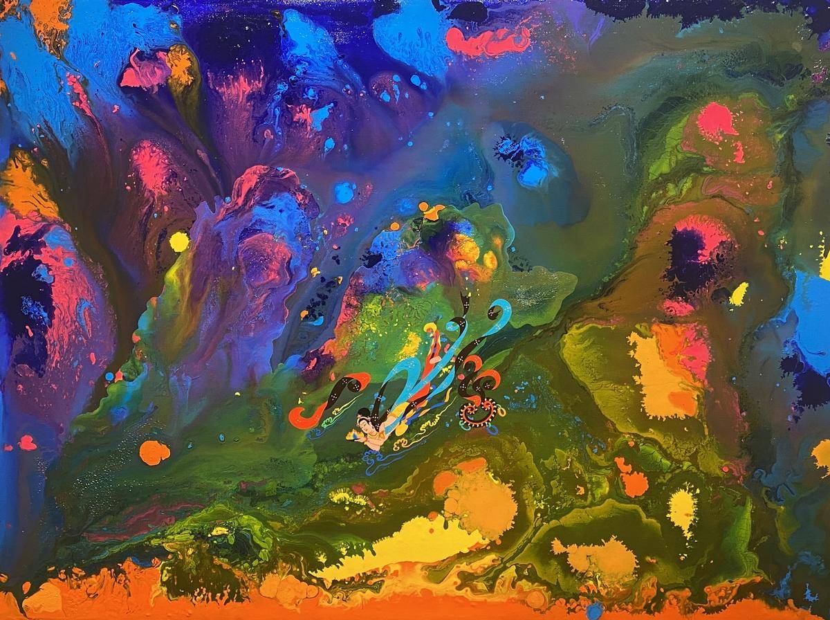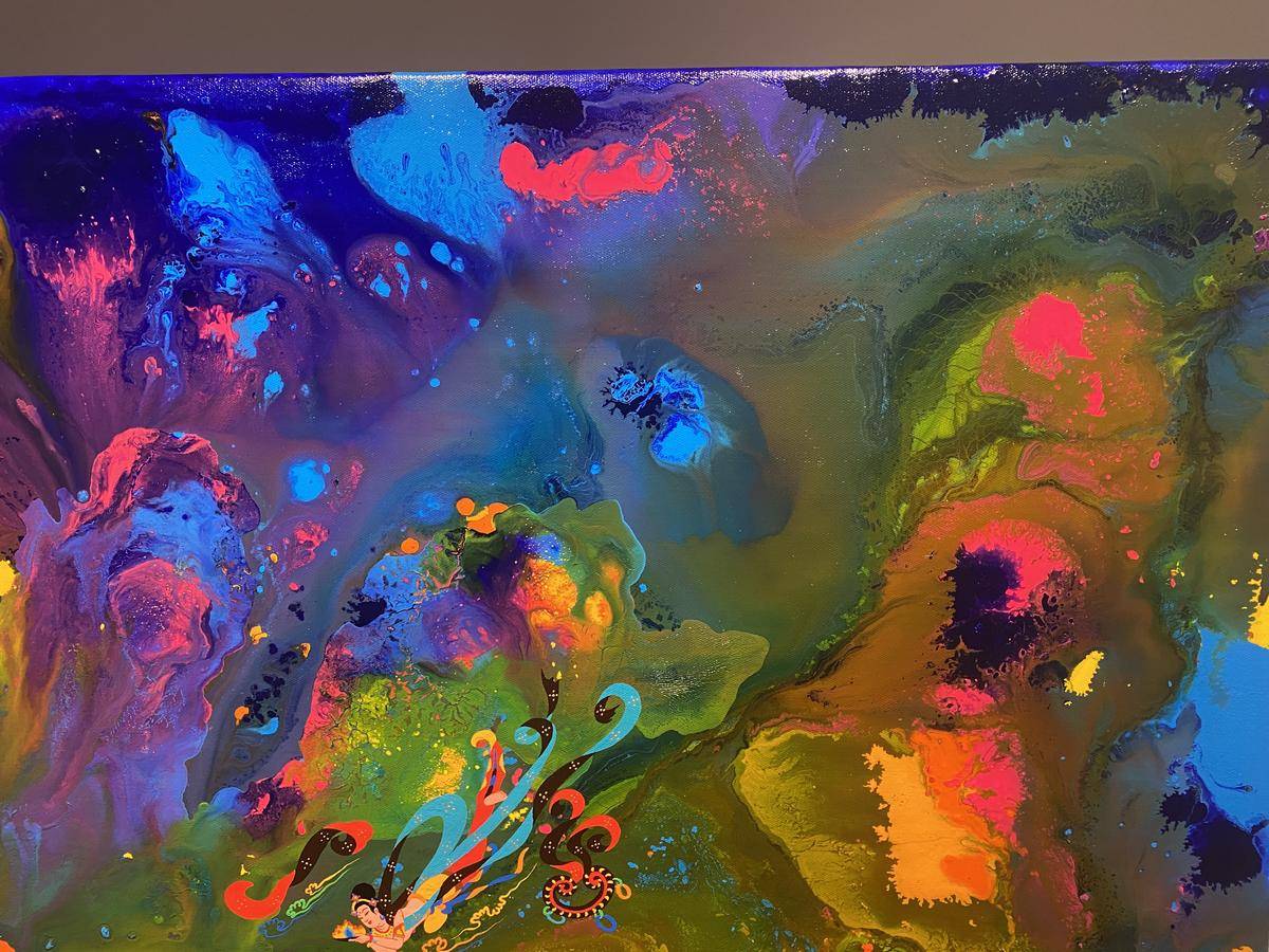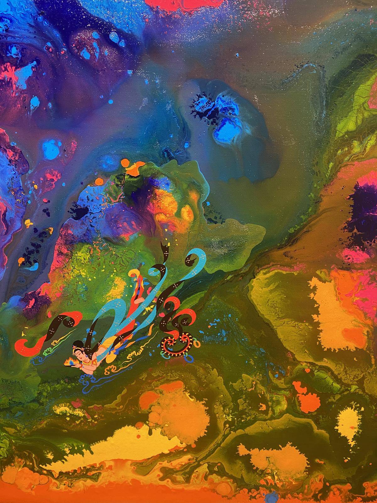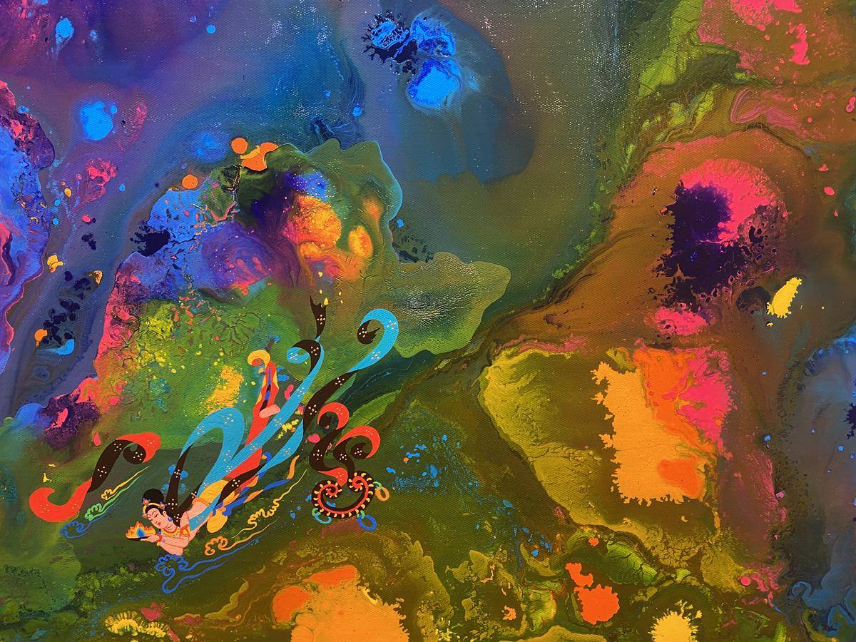 从绘画的意识层面来讲,飞天形象在画面中预示内心世界的自由,犹如颜料随意泼洒所形成的宇宙般浩瀚的梦幻世界,如梦境一般通向内心的精神深处,触碰灵魂。内心世界的自由建立在一个人内心的满足感,希望通过这种浩瀚、梦幻的强烈色彩画面,让人进入超现实、梦境、童真…