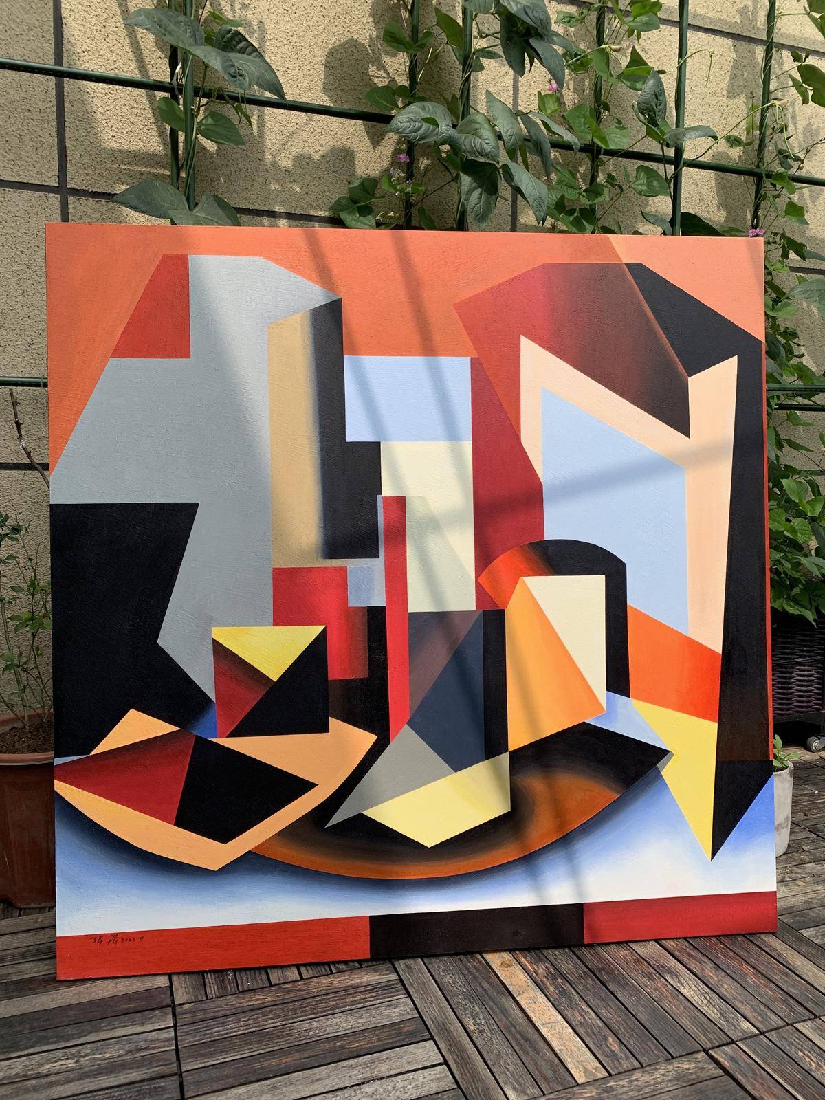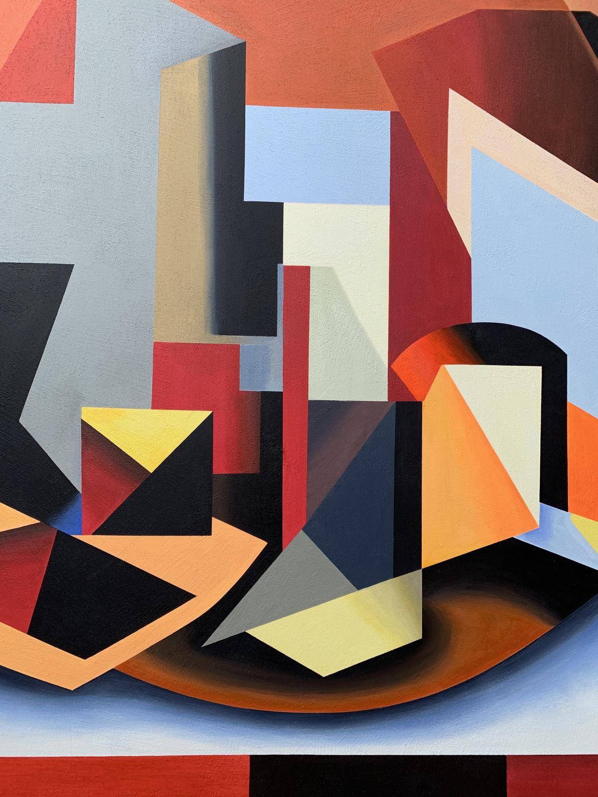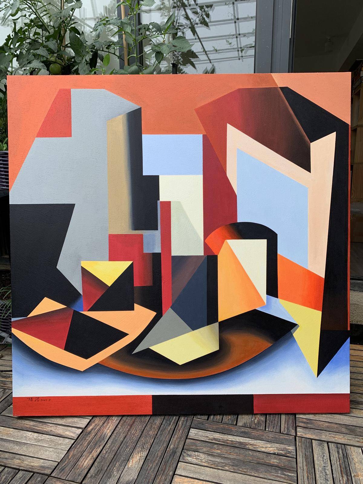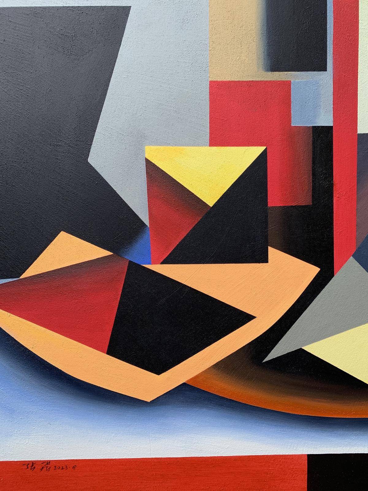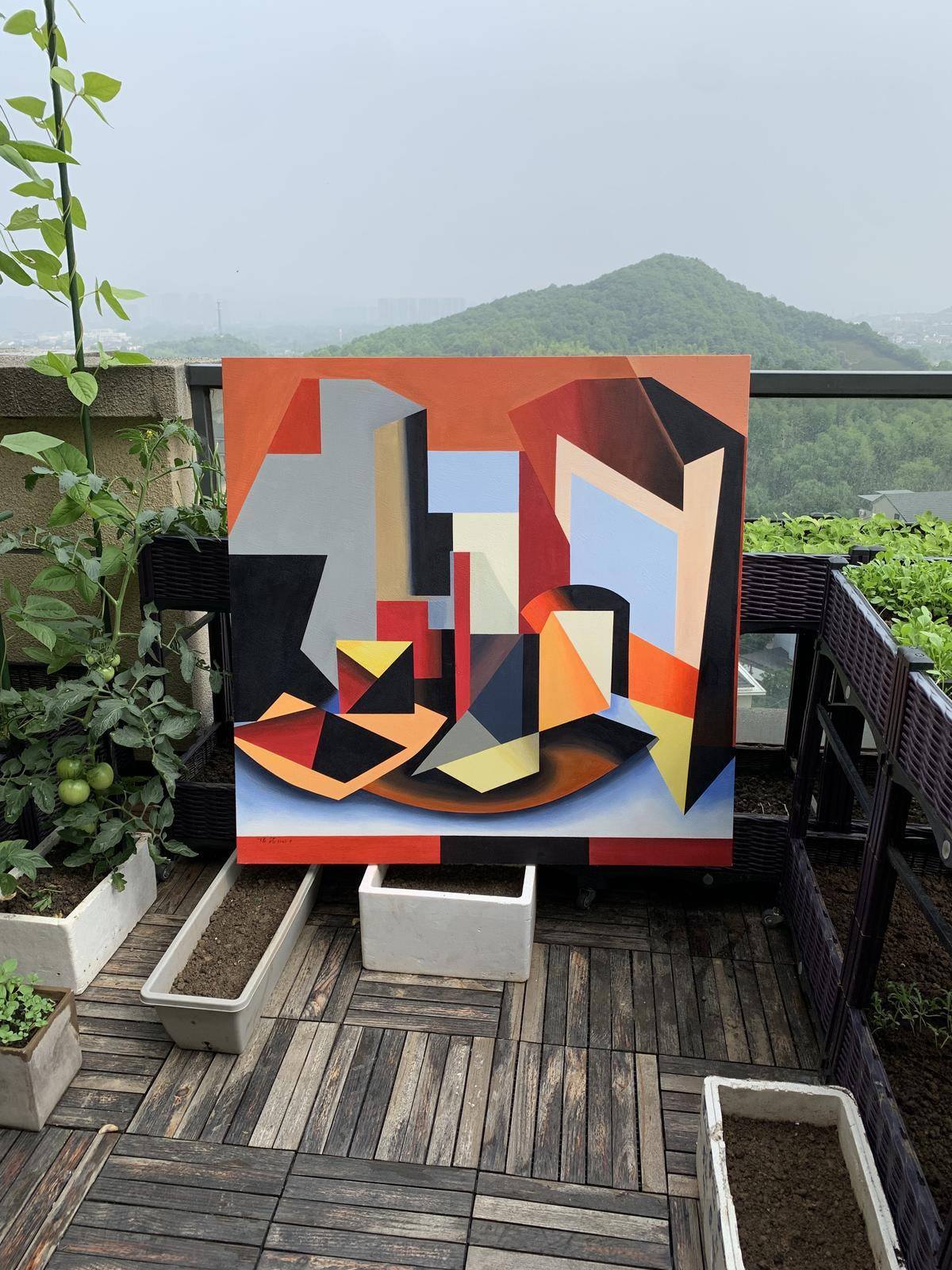 把物体的形态特征进行分解,重新组合形态、画面的整体结构空间作为我创作重点!通过几何形态和立体构成来表现艺术作品的深度和空间感。采用冷暖色调强烈对比的方法来强化画面的效果,这是非常巧妙的设计。蓝色和玫瑰红 桔红的搭配也是非常有趣的尝试,既有强烈的对比又不失和谐整体性,非常符合抽象立体主义的美学理念。