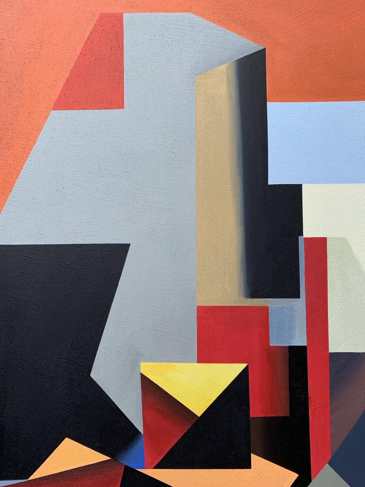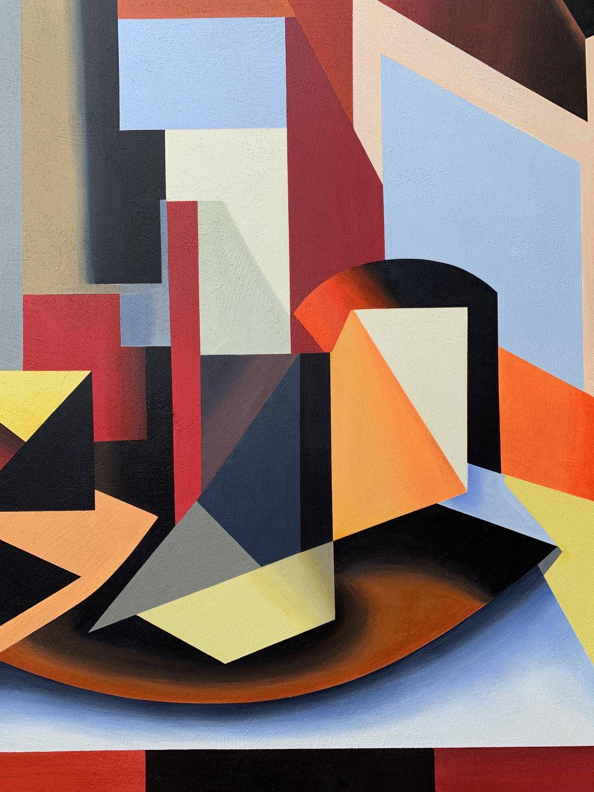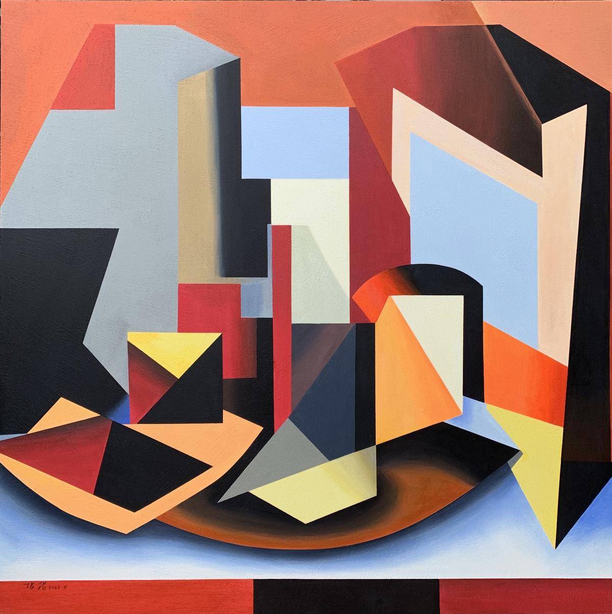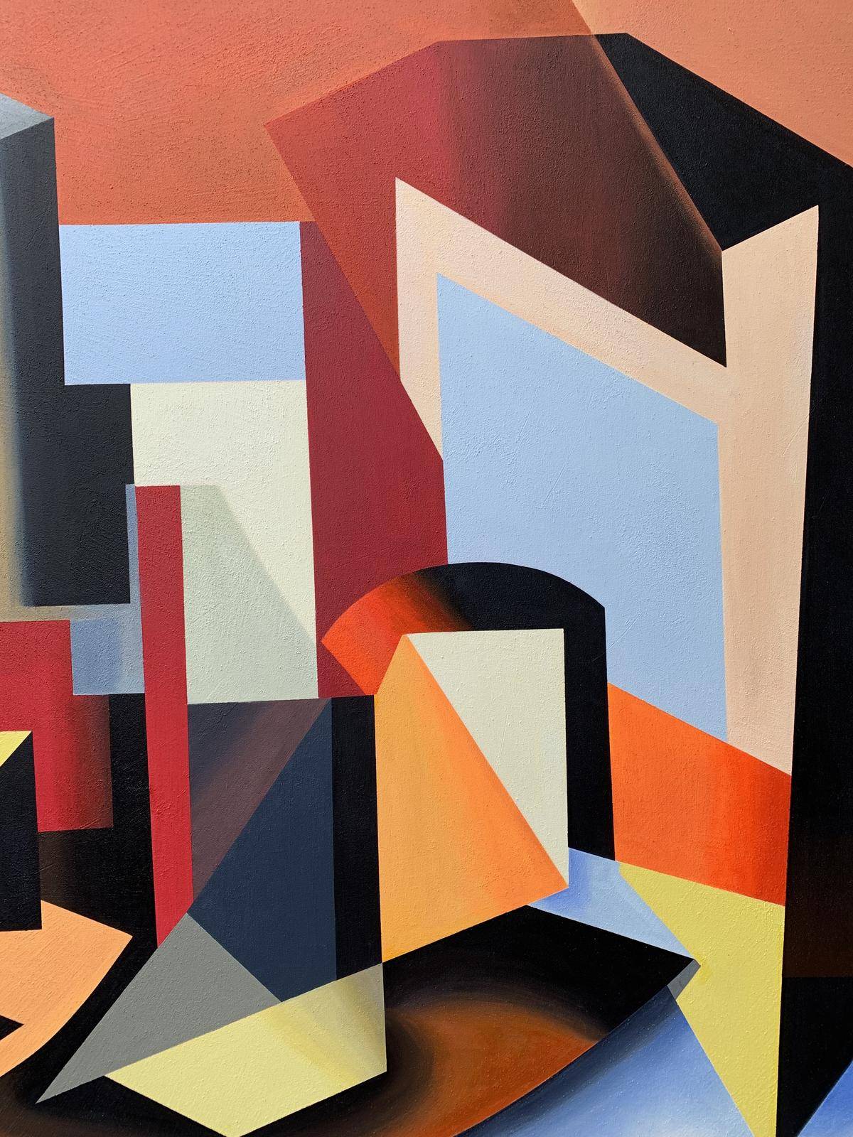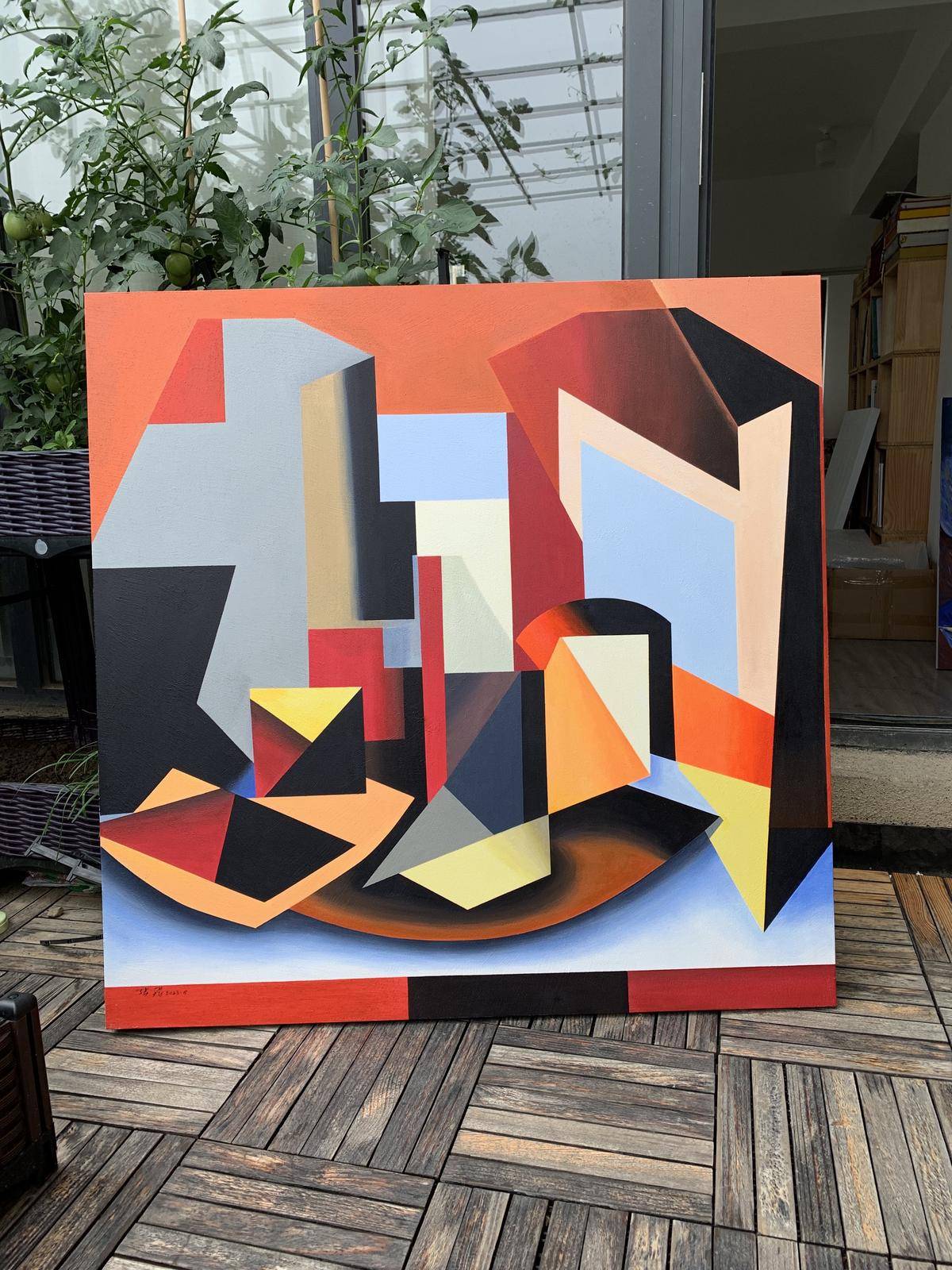 把物体的形态特征进行分解,重新组合形态、画面的整体结构空间作为我创作重点!通过几何形态和立体构成来表现艺术作品的深度和空间感。采用冷暖色调强烈对比的方法来强化画面的效果,这是非常巧妙的设计。蓝色和玫瑰红 桔红的搭配也是非常有趣的尝试,既有强烈的对比又不失和谐整体性,非常符合抽象立体主义的美学理念。