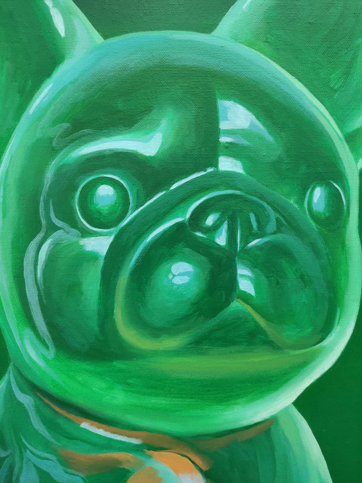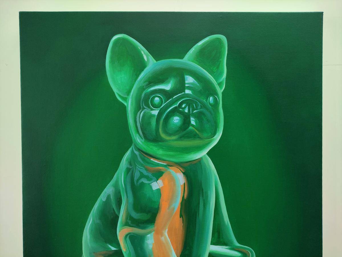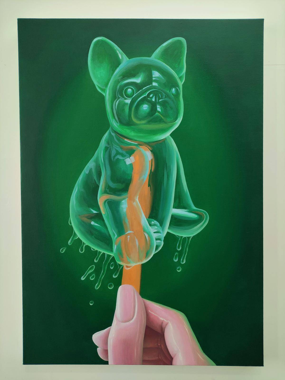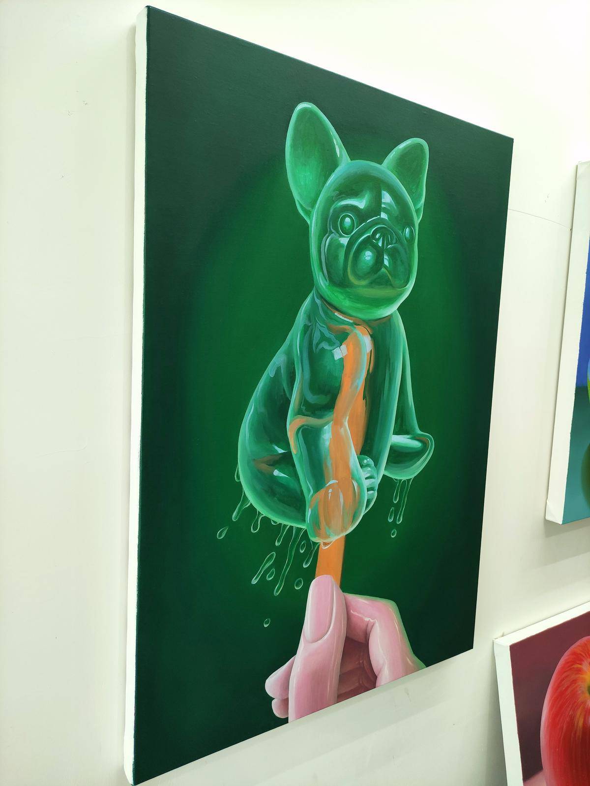 我尝试给寻常的事物赋予不寻常的材质和质感,从而给人以奇妙的视觉体验,斗牛犬小狗的造型被替换成晶莹剔透的玻璃或冰块的质感,融化的水珠滴落,炎炎夏日,来舔一口冰爽的小狗