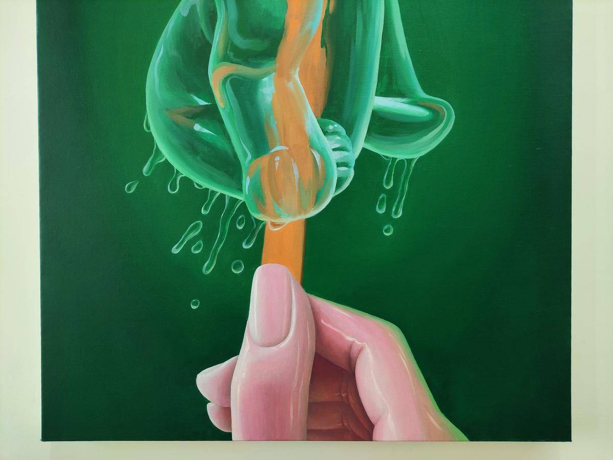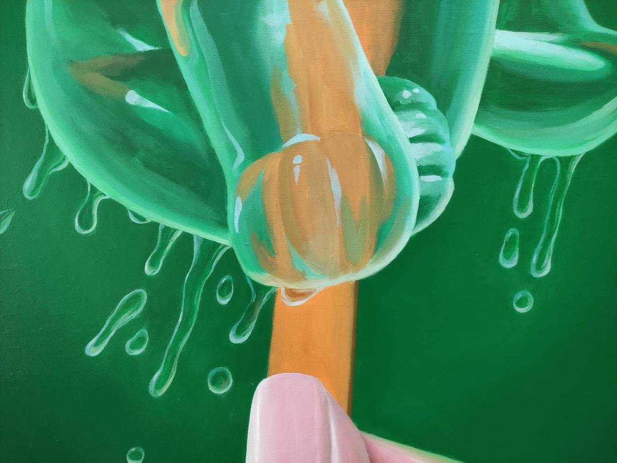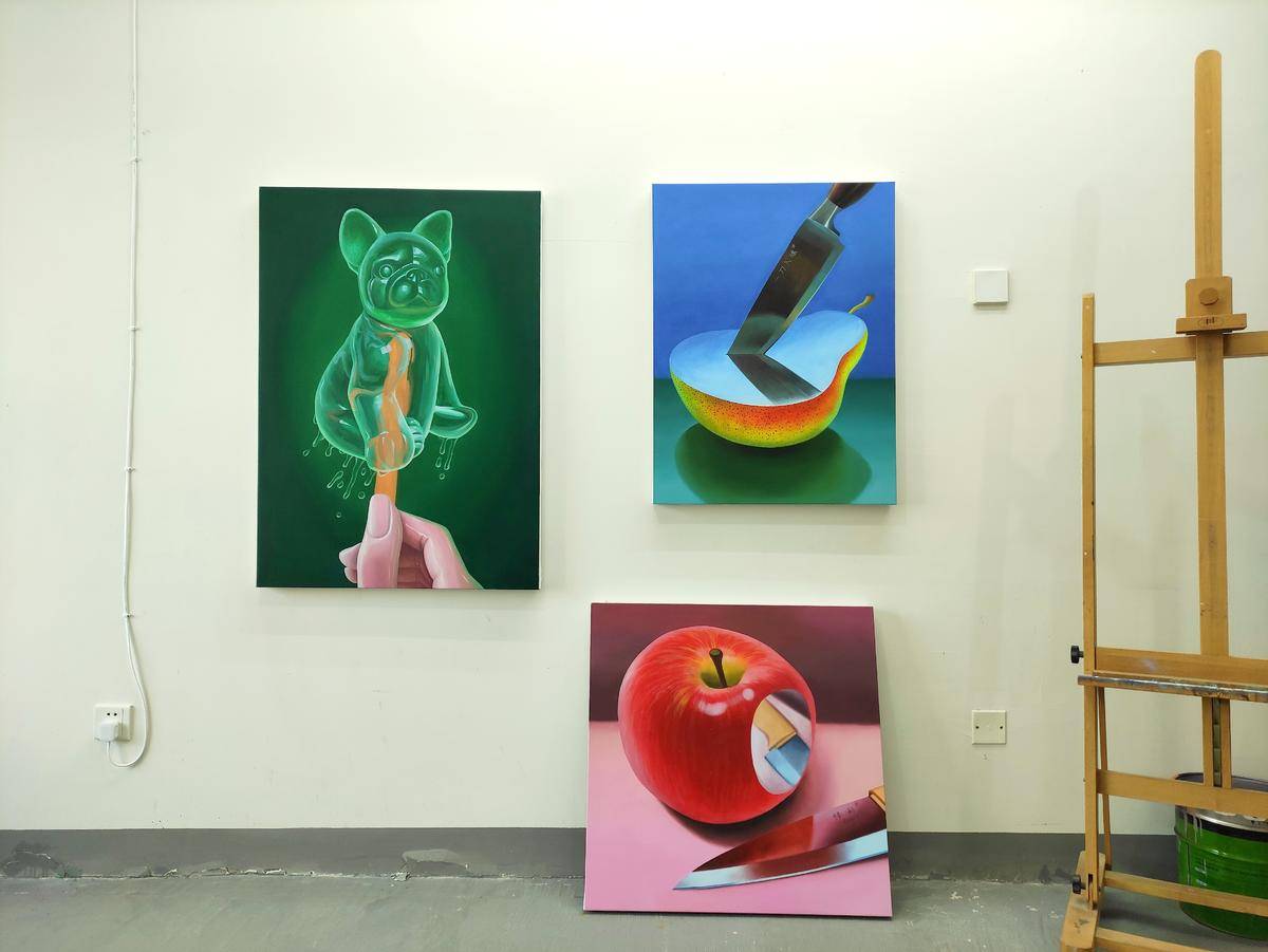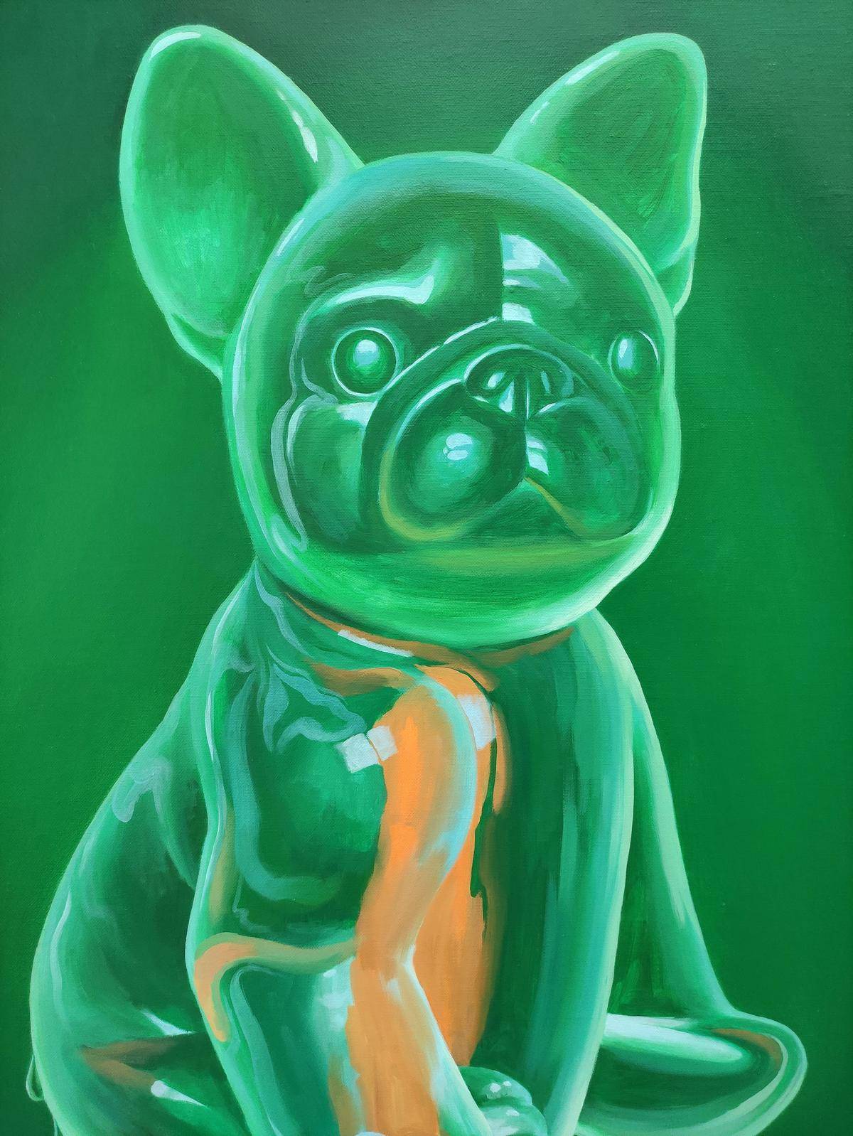 我尝试给寻常的事物赋予不寻常的材质和质感,从而给人以奇妙的视觉体验,斗牛犬小狗的造型被替换成晶莹剔透的玻璃或冰块的质感,融化的水珠滴落,炎炎夏日,来舔一口冰爽的小狗