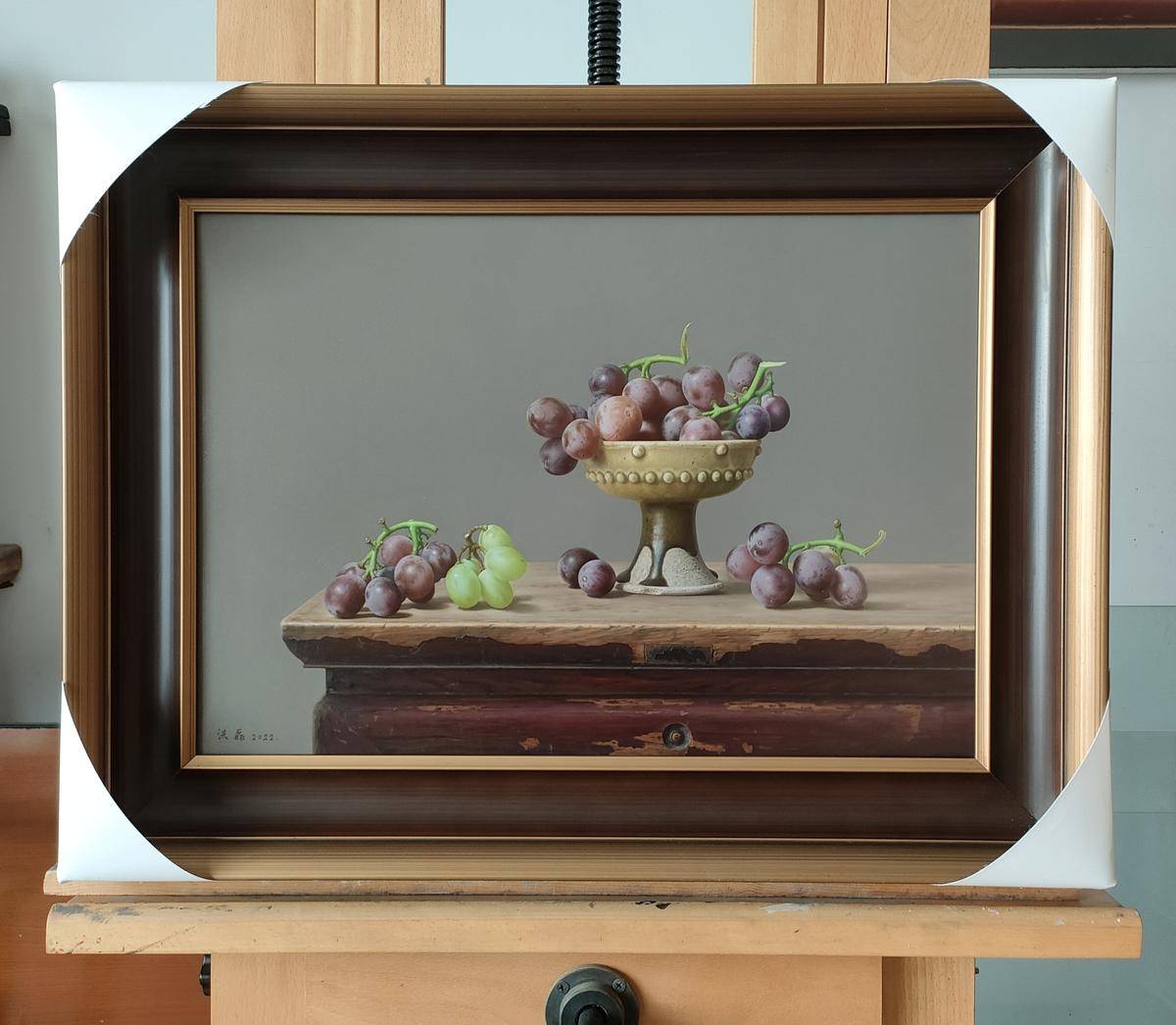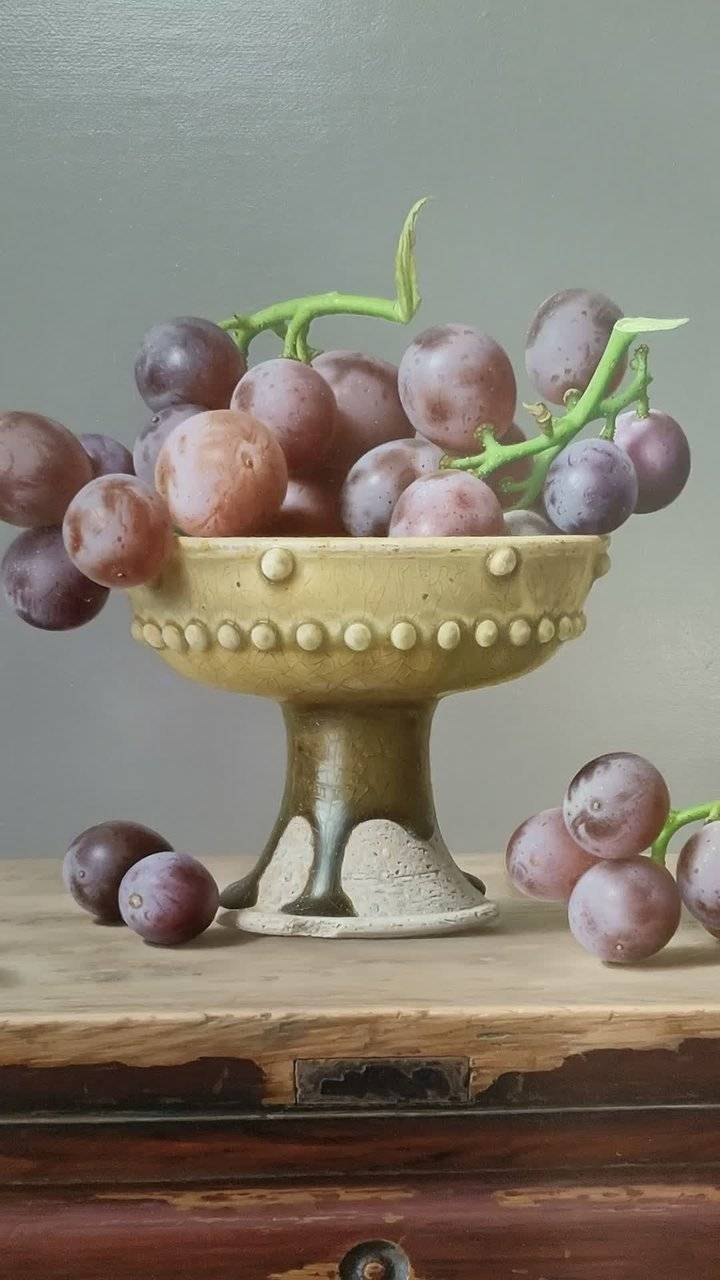 这幅作品通过对静物的精心选取、巧妙构图、和谐色彩搭配与精湛质感描绘,营造出静谧且富有生活气息的画面,展现出写实艺术的独特韵味。#油画 #葡萄