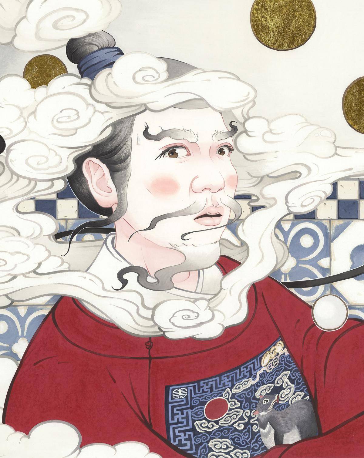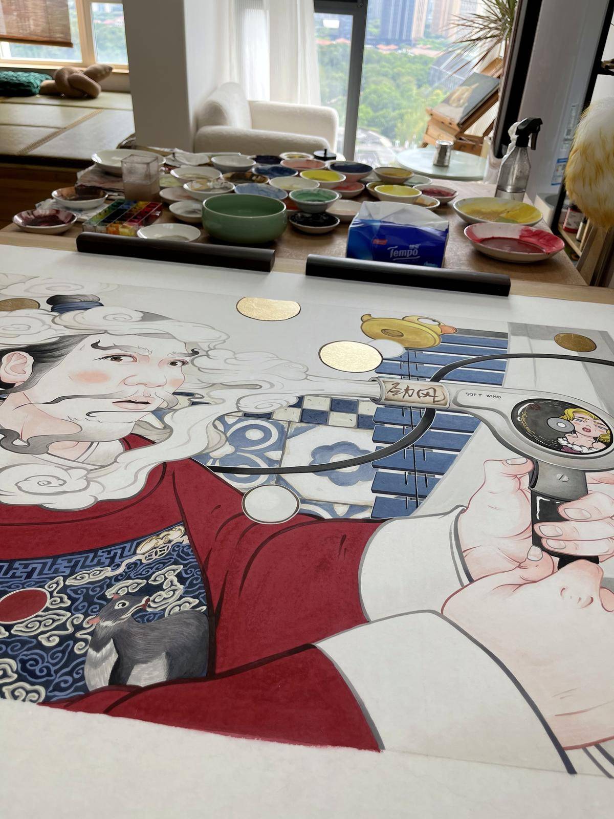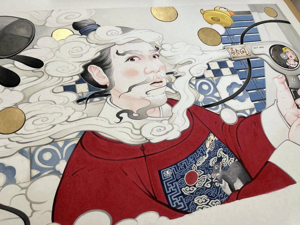 人造风这幅作品在古人系列中和《神品的启示》一样属于以暗示性 隐喻性为主的作品 这类作品需要思考很多画面中的冲突点 所以一般很难产