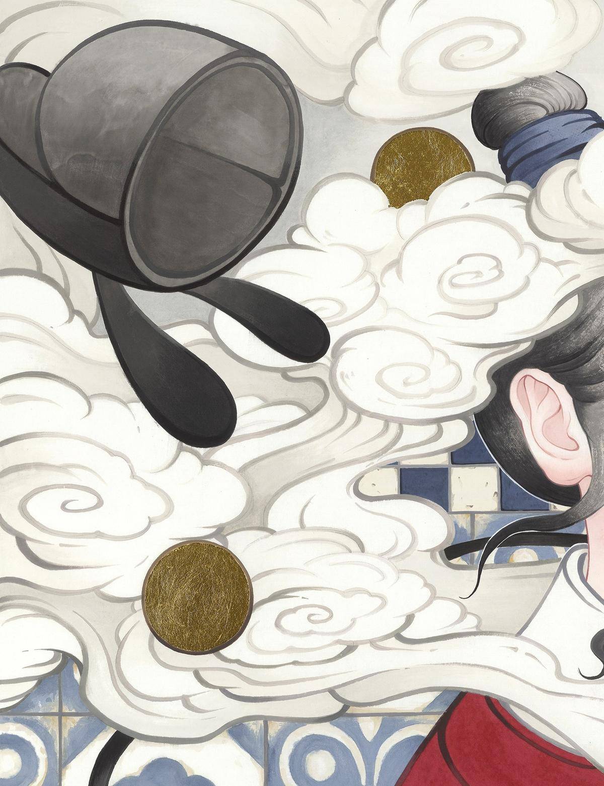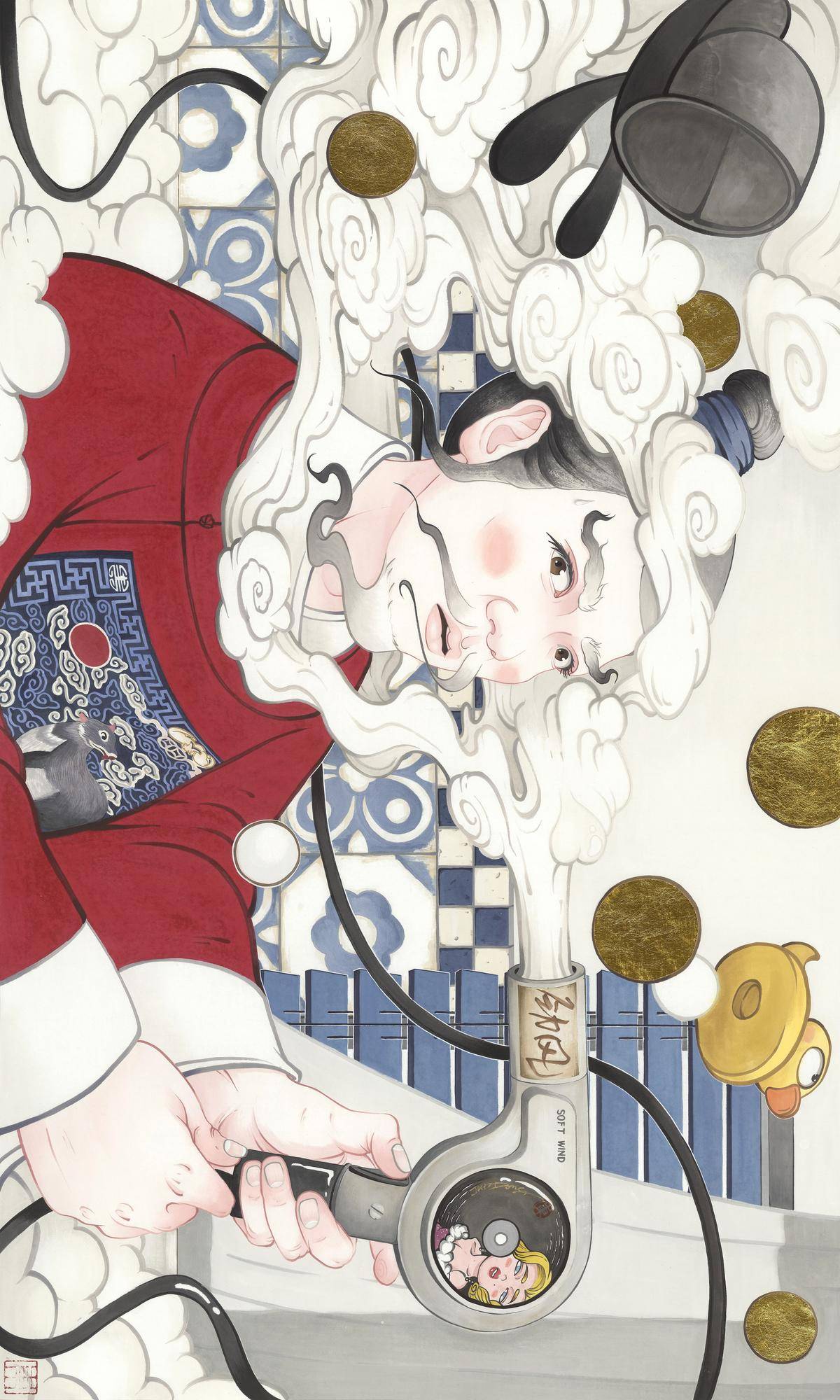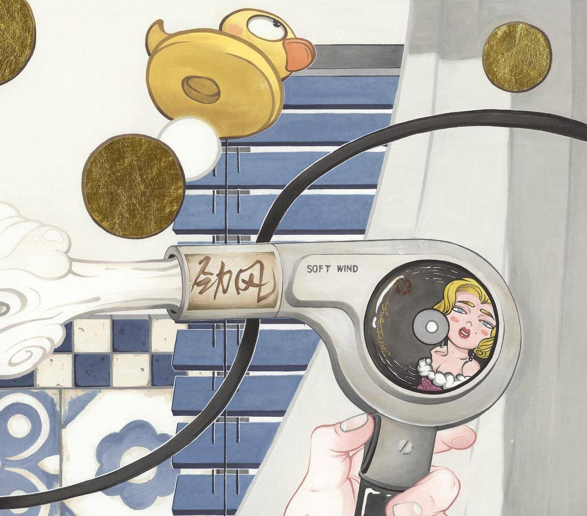 这副画结合了古现代的元素 古板和科技的碰撞 中西方人物冲突 可爱与严谨的对比 形式上方形的瓷砖 圆形的泡泡 贯穿整幅作品的电吹风的电线以次构成点线面的结合等