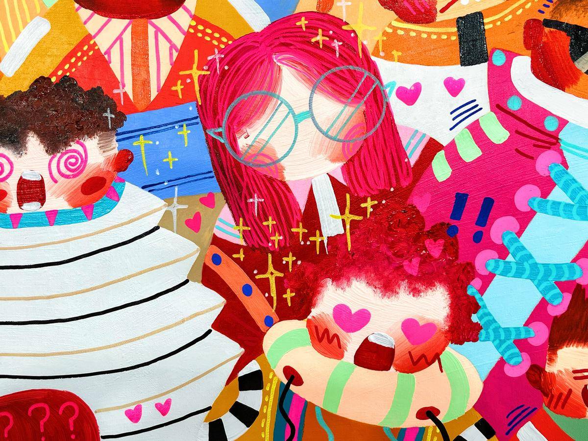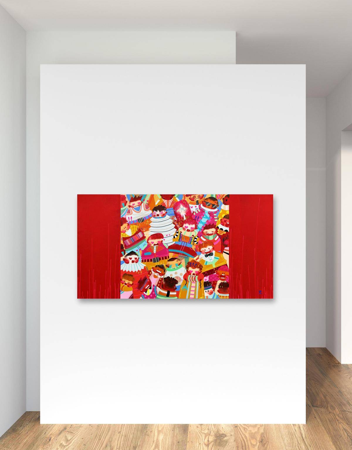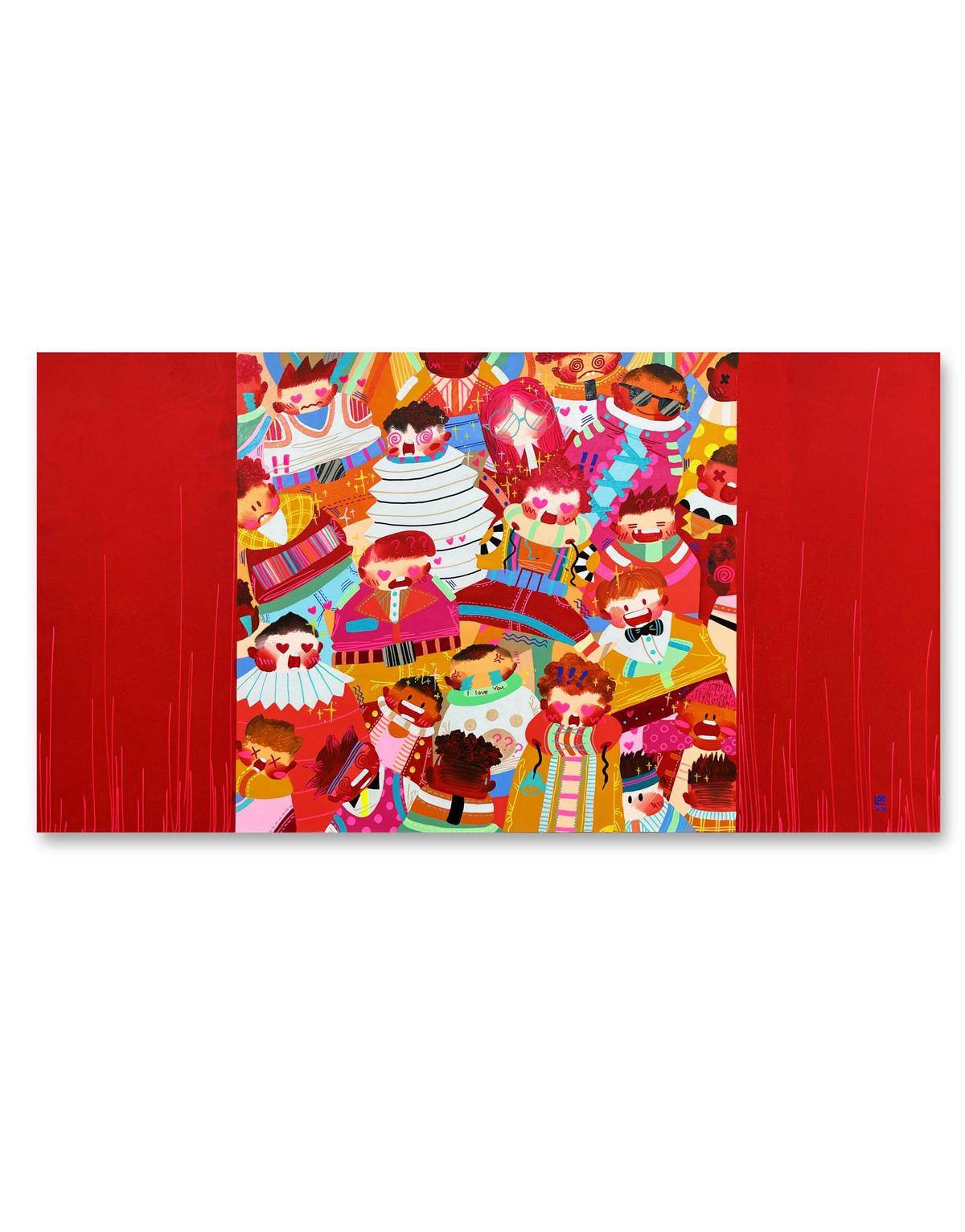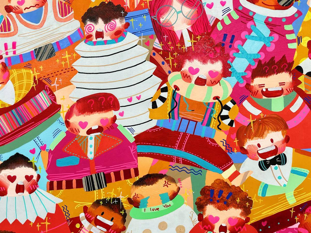 ▲ 身份与群体是我最近作品的主题,在这里,时间是静止的,空间是不稳定的,躁动的人群如同一场关于历史与未来的狂欢,他们是真实的,却又穿上了各式各样的戏服。我喜欢图像在解构里所呈现的运动状态,犹如直线过程里立体抛物的散点,是自由的可感知的秩序。这个不被规训的秩序深深的吸引我。我的创作手法是在具象写实的基础上,进一步将空间和结构平面化。关于色彩,我希望采用更加强烈的色彩对比,结合具象的图示呈现更加贴合当下的、近乎抽象的视觉体验。