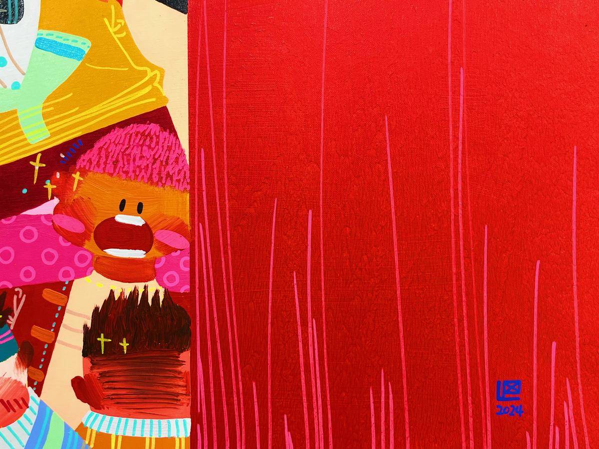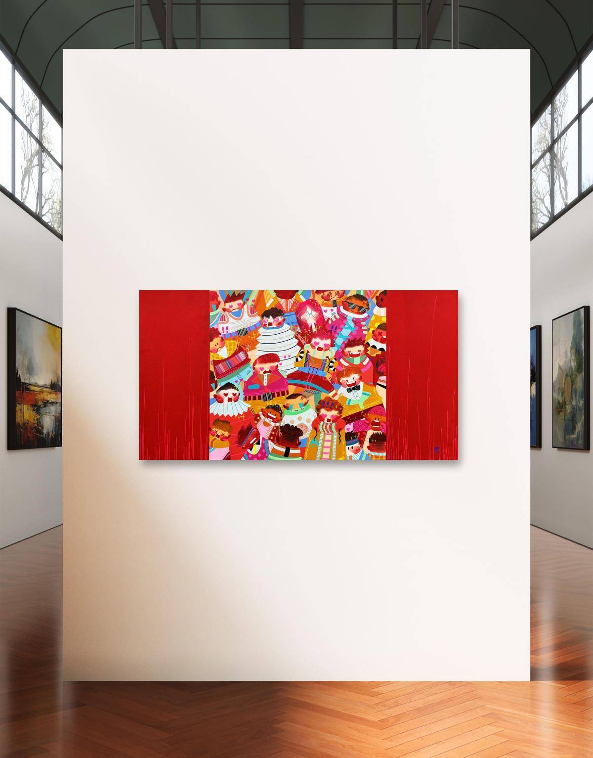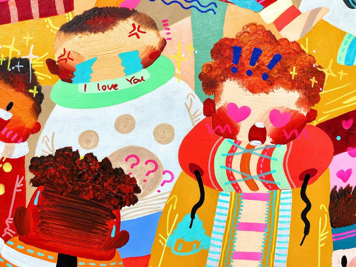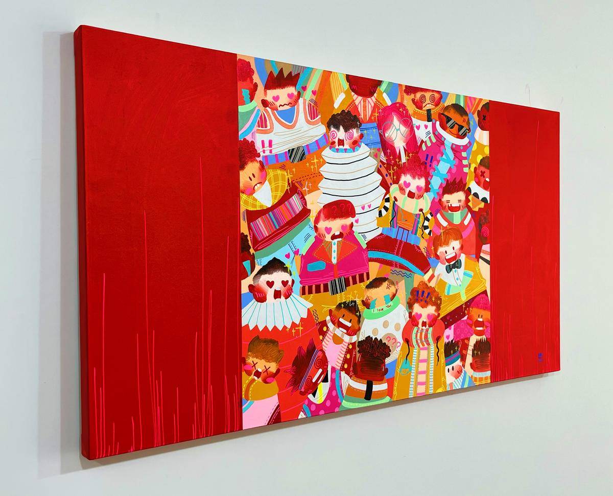 ▲ 身份与群体是我最近作品的主题,在这里,时间是静止的,空间是不稳定的,躁动的人群如同一场关于历史与未来的狂欢,他们是真实的,却又穿上了各式各样的戏服。我喜欢图像在解构里所呈现的运动状态,犹如直线过程里立体抛物的散点,是自由的可感知的秩序。这个不被规训的秩序深深的吸引我。我的创作手法是在具象写实的基础上,进一步将空间和结构平面化。关于色彩,我希望采用更加强烈的色彩对比,结合具象的图示呈现更加贴合当下的、近乎抽象的视觉体验。
