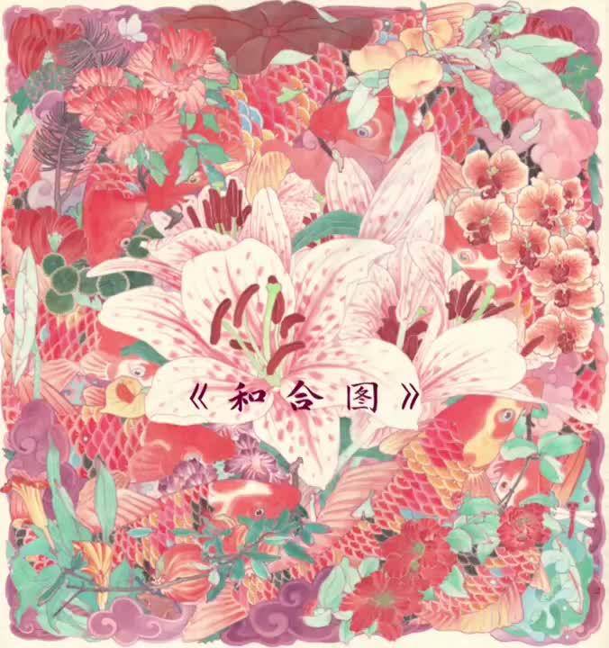 作品内容:以百合花为中心,周围紫色祥云萦绕,九条锦鲤环绕游弋,锦鲤各自衔着花卉仙果,有牡丹、松枝、虞美人、木槿花、马蹄莲、红石榴、山茶花、荷叶、蝴蝶兰、蟠桃等。
